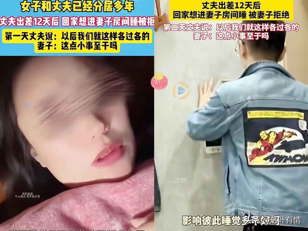 妻子和丈夫已分居多年, 丈夫出差12天回来后后, 以为小别胜新欢, 想推门进去妻子房间睡, 居然被妻子无情拒绝, 妻子的理由居然是影响彼此睡觉多不好,既然不爱了还维持多年婚姻到底是为何,不爱了就趁早放手才对呀, 分居多年两人的心早就不在一起了, 你想的激情人家早就不愿意了, 第二天老公就说以后咱俩各过各的, 妻子认为就这点小事至于吗? 这不妥妥是婚姻牢笼吗? 有媳妇却不能碰, 可远观而不可亵玩焉, 这是被妻子玩的明明白白呀, 这样冷战久了早晚要出事, 毕竟没有激情的婚姻是持久不了的! 大家觉得两人会不会离婚? 婚姻与家庭 分居型夫妻 丈夫出差 老婆好久不开车 两地分居婚姻