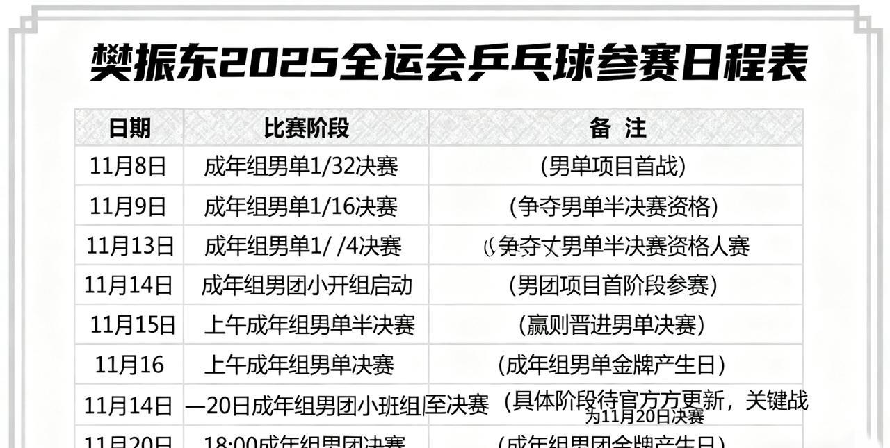 樊振东回归!将于11月份参加全运会,最新赛程和参赛名单出炉! 结束了10月德甲首战(萨尔布吕肯2:3不敌云达不莱梅,樊振东一胜一负)后, 樊振东于10月6日(中秋节)启程回国,抵达上海后将进行封闭训练,于11月7日至20日在澳门代表上海队出战男单、男团比赛,届时将可能直面马龙、王楚钦等一众国内顶尖高手! 男单参赛名单已于2025年3月底确定,32个正赛席位已全部产生。其中,马龙、樊振东、王楚钦、林诗栋、梁靖崑、林高远等6人因世界排名或赛事成绩直接晋级(樊振东是上一届全运会男单冠军),其余26名选手通过资格赛获得正赛资格。 结束全运会比赛后,"小胖"预计会在12月重返德甲!除此之外,还有欧冠、德国杯和乒超等赛事接踵而来。 #樊振东# #中国乒乓球# #国乒#