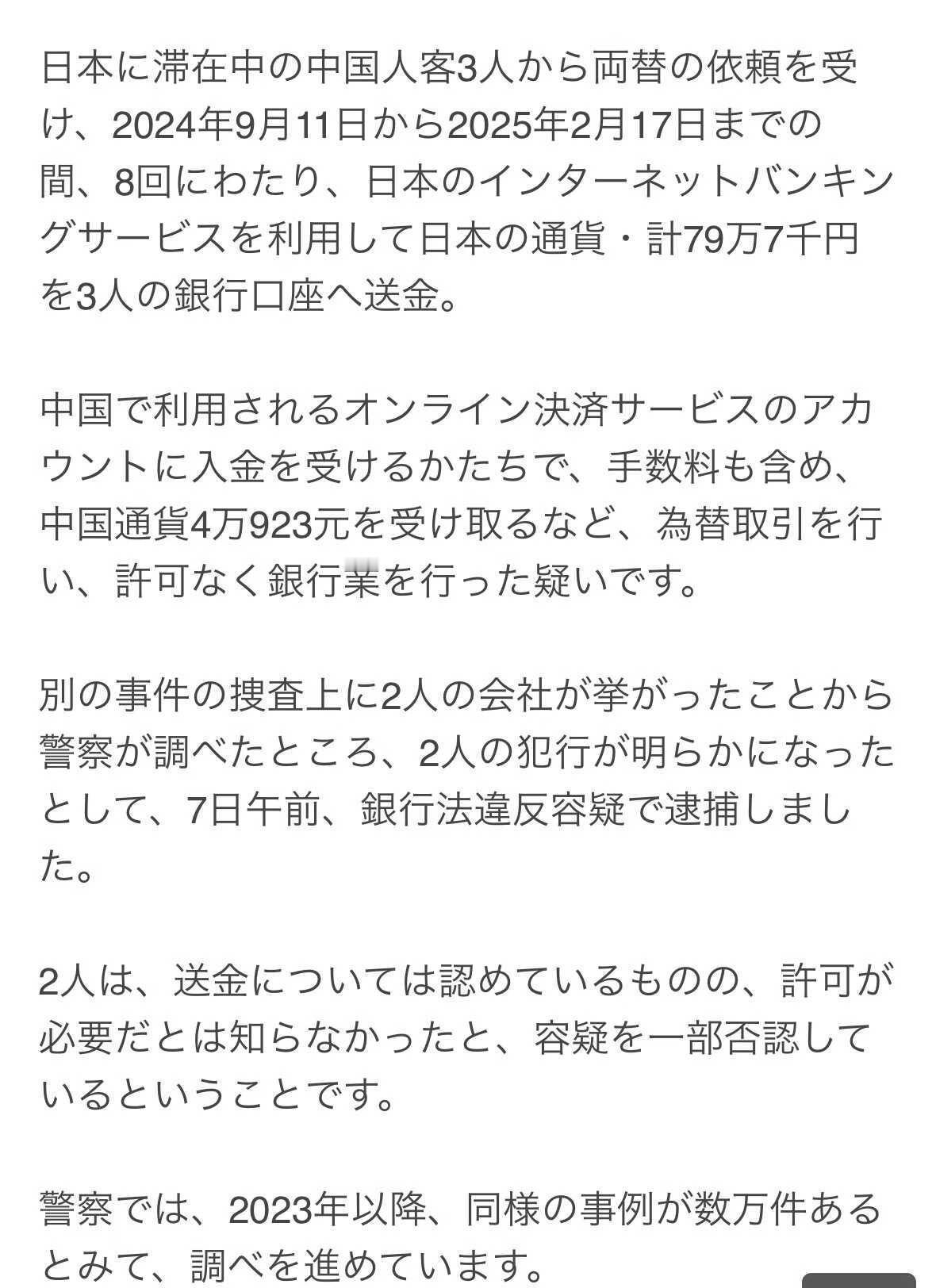 在日本生活可得注意了,最近有对中国夫妻因为帮人换汇被警察抓了。 这对在埼玉县经营房产中介的40多岁夫妇,平时主要做中国人的生意。他们在国内网站打广告,说能帮忙把人民币换成日元。有三位在日中国人找他们换钱,从去年9月到今年2月,这对夫妇往对方日本银行账户里转了79万多日元,同时通过支付宝收了4万多人民币,中间赚了点手续费。 就这么点事,怎么就把人抓了呢?问题在于,在日本干这种换汇业务必须要有银行牌照。这对夫妇说他们不知道需要办许可证,但警察可不听这个解释。据说从2023年到现在,类似案件已经有好几万起了。 其实很多在日华人都有换汇需求——留学生要交学费,打工的想给家里寄钱,觉得银行汇率不划算、手续又麻烦。于是微信群里就冒出各种“便民换汇”,看起来是互相帮忙,实际上在日本法律里这就是非法经营银行业务。 按照日本《银行法》,只要帮别人进行资金兑换、汇款,不管金额大小,都必须拿到金融厅的许可。否则就是刑事犯罪,最高能判5年徒刑或者500万日元罚款。 说白了,这种私下换汇虽然方便,但风险极大。你觉得只是帮朋友转个账,在法律上已经是在经营银行业务了。警察现在查得特别严,说不定哪个微信群早就被盯上了。 所以提醒在日本的各位,换汇还是走正规银行渠道最稳妥。别为了省点手续费或者图方便,把自己弄进局子里去,那可真不值当。