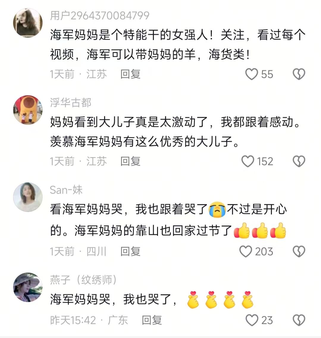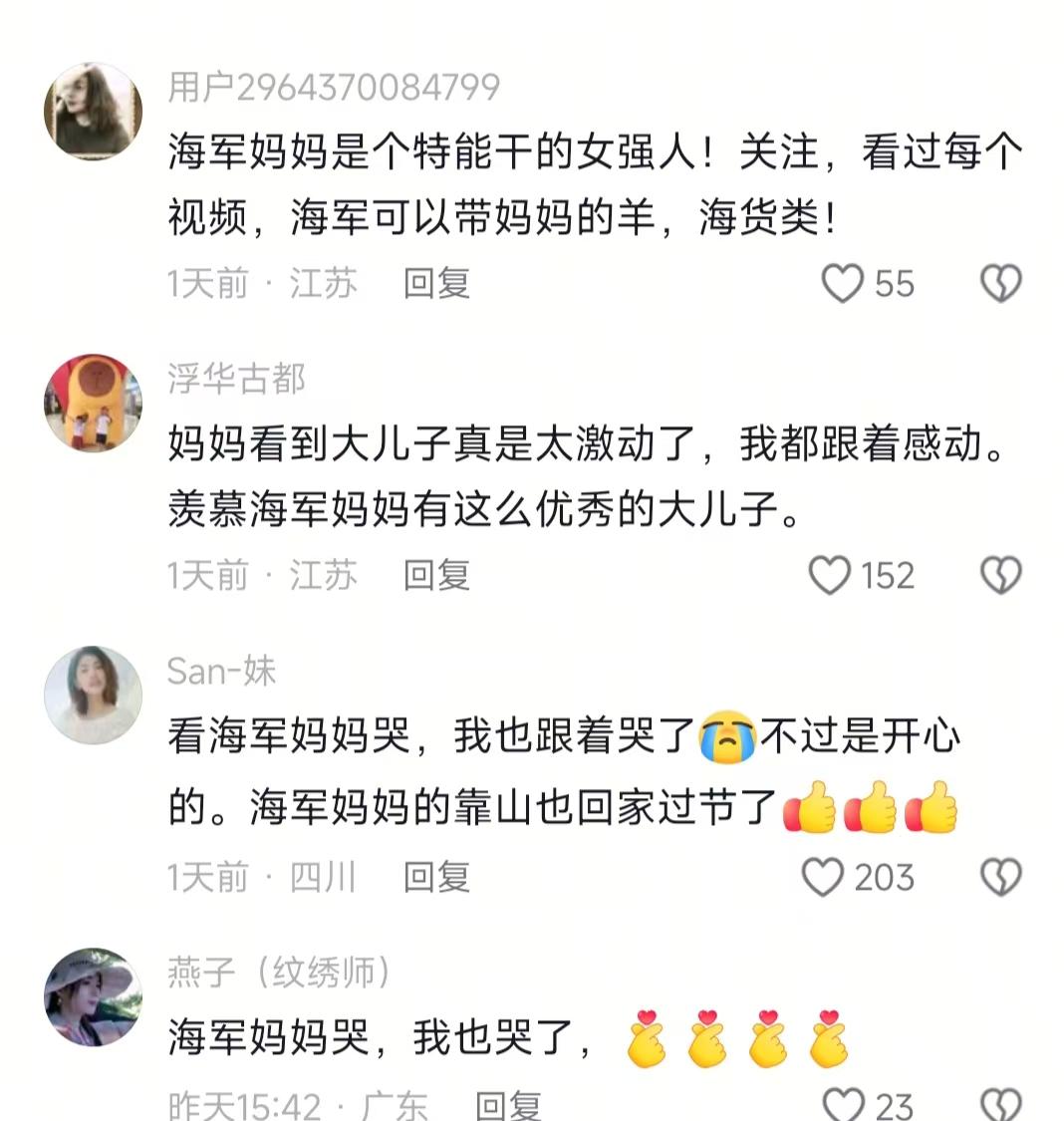 我预料到了刷到海军回家那事儿,会很感人 也预料到了海军小伙会过来过中秋节 万万没想到居然把车停在一公里外的停车场,就为了给妈一个惊喜,真没想到 说实话,今年中秋我搁家跟我妈视频,她嘴上笑着说“不用回来,我跟你爸吃挺好”,结果挂了电话没十分钟,我爸偷偷发了张朋友圈——桌上就一碟凉拌黄瓜配白粥,当时我鼻子就酸了,心里堵得慌。结果刷短视频时,刷到海军回家那事儿,直接给我看泪目了,你敢信?这海军小伙居然把车停在一公里外的停车场,就为了给妈一个惊喜,这波操作,我服! 本来他想直接把车开到家门口,省得顶着太阳走路,毕竟中秋莆田也挺热的。但后来又怕“万一妈从窗户看见车,惊喜不就泡汤了?”,就绕了远路,把车停在一个划着白线的公共区域,那地方看着挺偏,停好车还得走半天。路上遇到邻居大爷问“小伙子找谁啊”,他还得装糊涂说“找个朋友,顺路过来瞅瞅”,你说这憋劲儿,换成我早忍不住喊“妈我回来啦”! 海军妈中秋前就采购完了,就买了点米、面,还有几颗青菜,没买啥过节的硬菜。她本来计划中秋当天早上煮个粥,中午热个剩菜,晚上随便对付一口——毕竟女儿嫁出去了,儿子在部队,往年中秋基本就她一个人过,想想都觉得没意思。门窗也没特意收拾,桌椅还是平时的样子,一点节日氛围都没有,我看着都有点郁闷。 结果那天上午,她正搁厨房收拾青菜呢,听见门外有脚步声慢慢靠近。她擦了擦手走到门口,一开门看见海军站在那儿,手里就拎着个小背包。当时她就愣在原地,没说话,眼泪直接从眼角往下掉,顺着脸颊滴在衣服上。过了好几秒,才侧身让海军进来,自己走到沙发旁坐下,海军把包放门口柜子上,也跟着坐下。就这一分钟的事儿,我看得鼻子发酸,想起去年我妈生日,我突然回家,她也是这反应,后来她说“以为你忘了”,我当时特愧疚——咱总觉得时间还多,其实爸妈等不起啊! 海军把视频发出去没俩小时,就有网友在评论区问:“阿姨,有啥好海鲜不?过节想给家里人做,也想送点亲戚”。底下还跟着好几个附议的,都说“想看阿姨推荐,靠谱”。说实话,我当时琢磨,阿姨肯定得说“我这海鲜新鲜,口感好”,再提提野生的优势,结果人家倒好,直接回了句“我这边野生的海产品比较贵哈”,没半点虚的,连具体品种都没说,就先把价格的事儿摆出来了。 我当时还想,这阿姨咋不“包装”一下?比如说说“贵有贵的道理,没污染”啥的。结果翻评论区,全是夸实在的:“阿姨太耿直了,不坑人”“就冲这实在,想买也认了”。我才明白,现在人早听腻了“物美价廉”的空话,反而吃“实在”这一套。我姥姥之前总说“做人得实在,虚头巴脑的早晚露馅,就像人家说的,你种啥因,将来就收啥果”,以前我还觉得有点老套,现在看阿姨这样,还真是这么回事儿——不耍小聪明,反而让人信任。 还有网友更逗,在评论区单独留言,问阿姨:“你家鸵鸟产蛋了吗?有蛋的话我想买,给孩子尝尝鲜”,还加了个“星星眼”的表情。这条留言挺靠前的,估计阿姨一眼就看着了。我当时想,就算鸵鸟没下蛋,阿姨说不定会说“再等等,过阵子就有了”,毕竟能拉个潜在客户,结果人家直接回:“我家的鸵鸟还未成年,下不了蛋”,一点不绕弯子,连“以后可能有”的话都没说。 说实话,我之前刷到过不少卖货的,明明没有的东西,还说“预售中,先下单锁定名额”,结果最后要么扯皮退款,要么发些差的,跟阿姨比,差远了!就是这条回复的点赞数不高,一天下来才不到二十,我还挺纳闷:这么实在的回复咋没人捧?后来想,可能大家觉得“鸵鸟蛋”太冷门了,没海鲜关注度高,但阿姨这态度,我是真服——不为了流量瞎承诺,这才是真靠谱! 说真的,我翻了海军之前发的视频,不管是训练片段,还是执勤的场景,底下总有网友问“阿姨最近咋样”“阿姨身体好吗”,但他妈从来没回过一条评论,就跟“隐身”似的。我还以为阿姨不爱玩短视频,或者怕说错话,结果这次不光回了海鲜的咨询,还回了鸵鸟的,你说是不是因为中秋儿子回来,心情好,才愿意跟网友互动? 而且阿姨还开了家公司,就在远离莆田市区的地方,周边全是农田和海,离最近的居民区得有两公里。公司也没啥气派的办公场地,就一个简易的小屋子,里面放了台旧电脑、一部电话,还有几个文件柜,柜子里塞着客户信息和产品记录,跟那些装修得光鲜亮丽的公司比,稀了咣当的。但人家照样每天早起捕鲈鱼、捞海虾,还喂黑猪、养山羊,从早忙到晚,这劲头,比我这天天摸鱼的年轻人都强,太给力了! 现在网上有两种声音:一种说“阿姨火是因为‘海军妈妈’的标签,换个普通阿姨这样,根本没人看”;另一种说“人家靠的是实在,跟标签没关系,就算没这身份,也能被认可”。说实话,我也琢磨过这事儿——比如阿姨住集装箱、听台风拍铁皮,跟别的郊区创业者没啥不一样,但就是因为儿子是海军,关注度就比别人高,这是事实。总之,粉丝是涨了,这是好事,之于为什么会涨,谁又说的清呢,你说是吧!