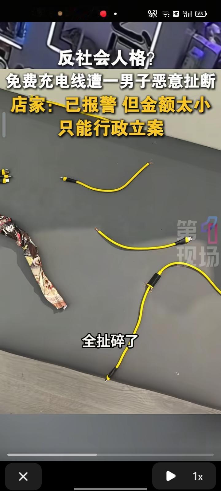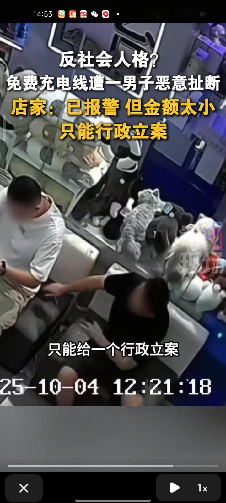 10月4日,山东烟台。网友发视频称,自己提供了免费休息区,能免费充电,一位黑衣男子在手机店免费充电后,临走前故意把充电线扯断了,中间没有发生任何矛盾。报警后,被警察告知够不上追逃标准,只能行政立案。