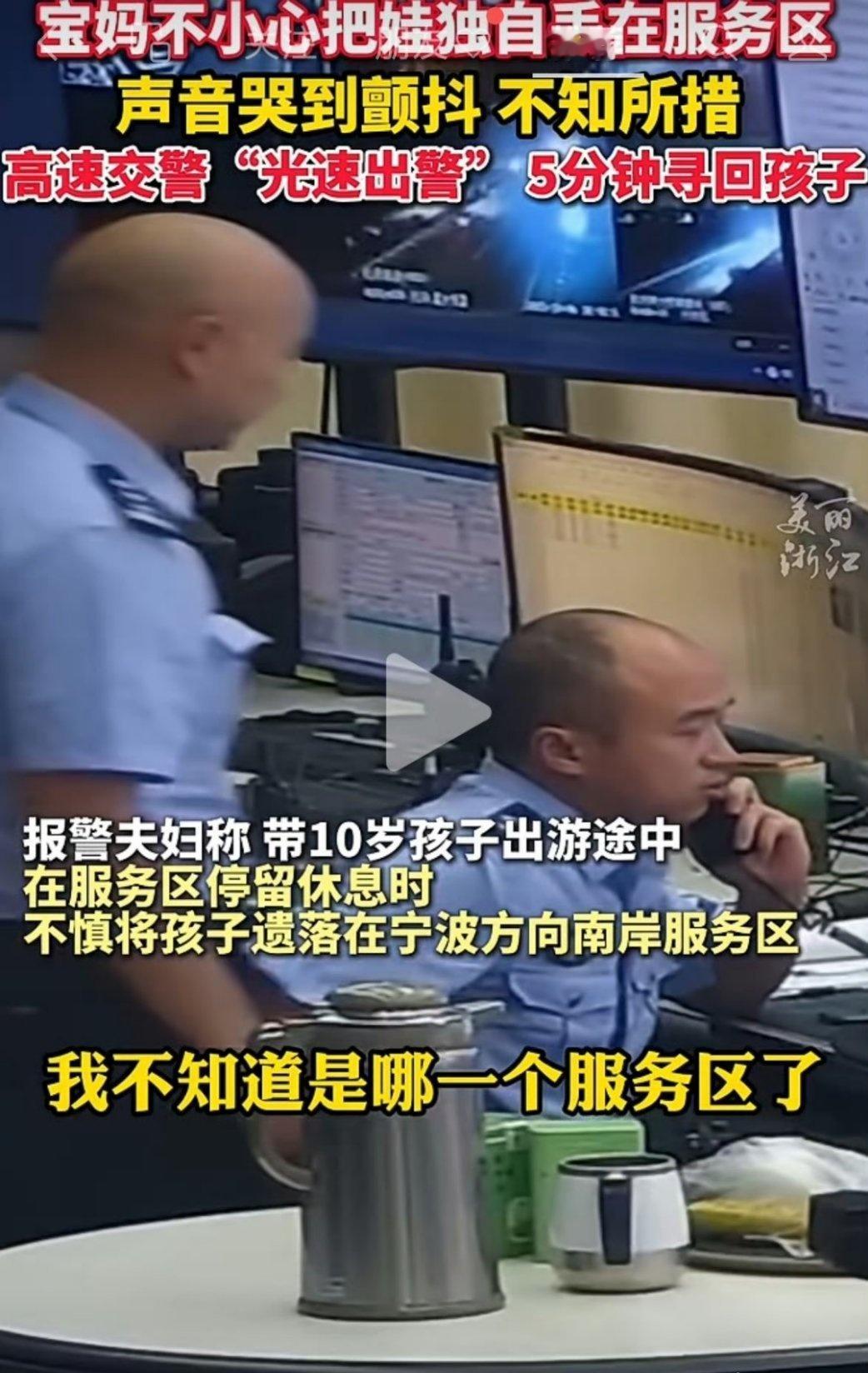 10月6日晚6点40分,一对家长在杭州湾大桥南岸服务区休息后,不慎将10岁孩子遗落在服务区,车辆驶出较远后才发现孩子未上车。紧张的父母随后报警求助。 接线员同步调取服务区监控录像,锁定孩子位置;电话引导家长返回服务区,并通过监控实时确认孩子动态;仅用5分钟,监控画面显示孩子父亲已从卫生间牵回孩子。 出门在外还是要确保孩子在视线范围内呀!
