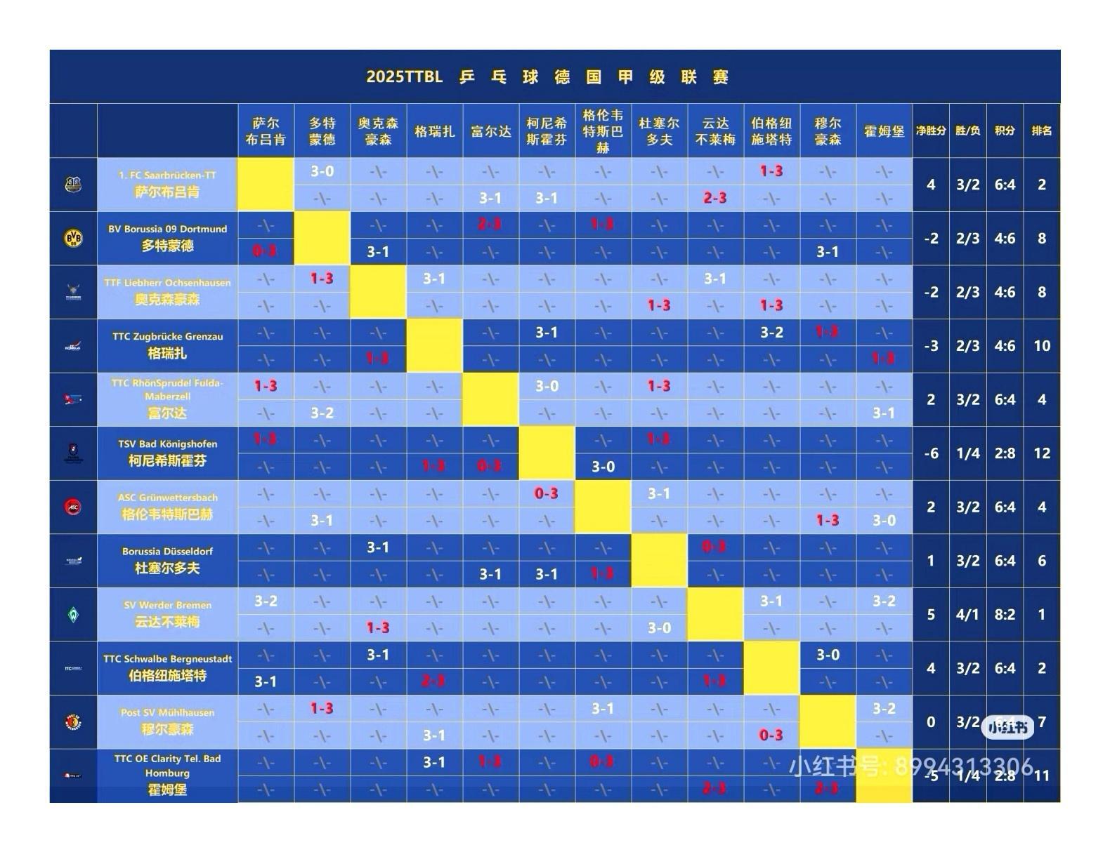 🏓 云达不莱梅俱乐部上升至首位,萨尔布吕肯与伯格纽施塔特俱乐部并列第二,富尔达与格伦韦特斯巴赫俱乐部并列第四。
