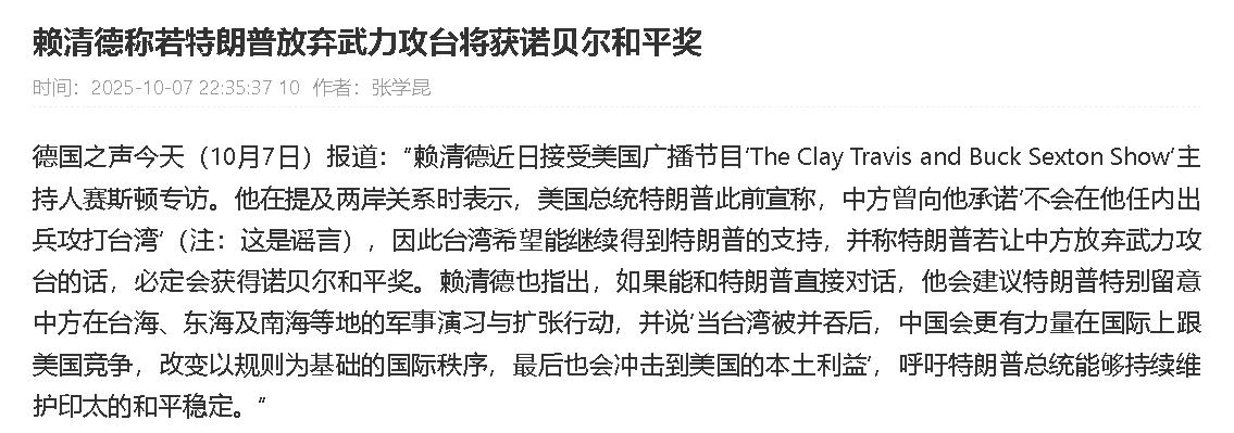 [下雨]赖清德突然出来对美国总统特朗普喊话了!赖清德表示,特朗普若让中国放弃武力攻台的话,必定会获得诺贝尔和平奖。赖清德声称,如果能和特朗普直接对话,他会建议特朗普特别留意中国在台海、东海及南海等地的军事演习与扩张行动,并说当台湾被“并吞”后,中国会更有力量在国际上跟美国竞争。 赖清德这种“拉盟友”方式带着一点戏谑,也带着几分焦虑,基本上暴露了台湾当局面对当前复杂国际局势时的无奈和赌气心态。 台湾问题是中国的内政,不管国际上怎么争论、美国怎么表态,就一句话:这是中国的家务事,轮不到外人插手。 几十年前,美国和中国建交时早就把规矩立好了,承认世界上只有一个中国,台湾就是中国的一部分,这是两国合作的基础,不是哪个能随口喊一喊就能变的。 赖清德在这里故意把台湾问题吹成国际热点,说中国在台海、南海“惹事”,背后的目的就是让美国政客警觉,继续给台湾撑腰,甚至加码支持。 特朗普讲究实际利益优先。台湾拼命买美国武器,可大陆的经济和军事体量远远超过台湾,不是花钱就能解决的。特朗普如果觉得台湾“成本太高”,也可能转头去谈判。 大陆目前的政策非常清楚,虽然主张和平统一,但也绝不丢掉维护国家主权这根底线。最近几年中国在台海和南海有不少动作,主要是为了防止外部干预,也回应一些挑衅行为。 赖清德把这些都夸大成威胁,无非是想把问题变复杂,把美国拉进来,但最后真的受损的只能是台湾自己。 赖清德不仅在喊话里抛出了所谓中美竞争、国际秩序失衡,甚至还把诺贝尔和平奖当作诱饵,似乎希望美国为了“奖项”彻底站在台湾这一边,但这种做法有点对大国博弈的误判。 国际奖项看的是实际成果,不是口头承诺;特朗普如果真想拿奖,还不如促成两岸谈判,而不是听信赖清德的挑动。这种借助外力、立场激进的做法,表面上是高调出击,实际背后却藏着不少不安。 另一方面这种态度也反映台湾内部的焦虑。台湾和大陆关系脱不开经济联系,一旦真闹出摩擦,灾难首先会落在台湾民众头上。赖清德这套强硬表态反而容易让岛内多数人觉得他太冒进、风险太高。 从国际环境来看,美国历届政府一直很谨慎,不会轻易碰触台湾这根敏感神经;美方长期强调遵守“一个中国”政策,只要不给台独背书,就是维护全局稳定。 赖清德的策略把自己摆在国际对抗的前沿阵地,但真到了需要权衡利益时,大国之间目标还是自身更重要。 而且赖清德对特朗普的性格似乎没有多少了解。他急着劝特朗普关注中国动作,这种“教唆”方式很容易引发反感,特朗普向来不喜欢受人指挥。 所以结果大概率适得其反,特朗普不买账的话可能让台湾更尴尬。在外交惯例里,这种跨级喊话本来就难有实际效果,多半只是表面文章而已。 最近中国推动对台融合,便利政策和交流平台不断推出,经济合作也在升温。历史经验一再证明,外力支持不是解决台湾问题的长久之计,赌气高喊只会加剧彼此对立,为台湾自身增加更多压力。 赖清德这一通把美国总统扯进来的喊话,打的是高空球,想通过放大中国大陆的动作制造紧张气氛,设法让国际社会尤其美国坚定支持台湾,甚至煽动更强硬介入。 但国际大势始终主导着局面,台湾的最终命运并不会因为一场采访或一番喊话而有翻天覆地变化,走到最后,选择对话和认清实际情况,才是既务实又有出路的办法。