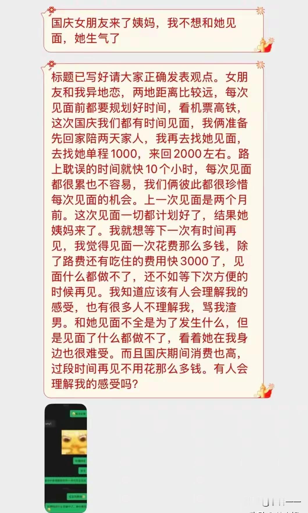 "太下头了[尬笑]"!国庆长假,一女子因来大姨妈,于是异地男友取消了原本约定好的