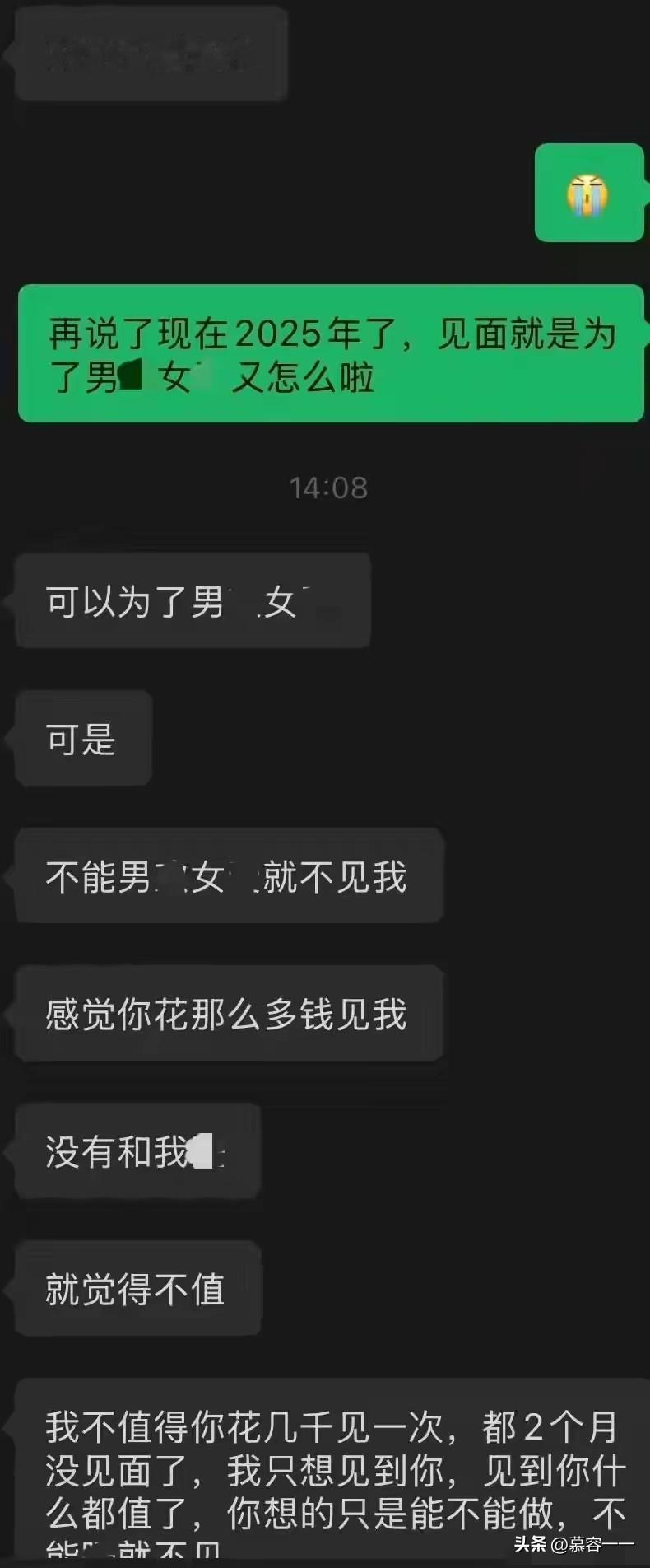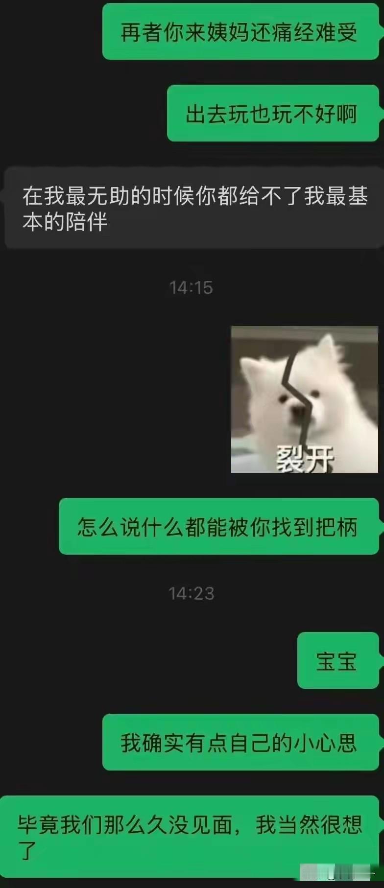 "太下头了[尬笑]"!国庆长假,一女子因来大姨妈,于是异地男友取消了原本约定好的见面,理由是:见面什么都不能干,还浪费钱,不值得。网友:太渣了! 原来,女生和男朋友是异地恋,两人相隔1000公里左右,这一次趁国庆长假,两人相约见面。 结果,临近国庆长假,男友得知女友来大姨妈了,于是他便单方面取消了这一次的见面计划。 他给女友的理由是:宝宝,你大姨妈来了,我们见面什么事都做不了,等下次吧,下次月中和双休一起加起来有四天,我再过去找你! 女子感觉男朋友太现实了,觉得他和自己见面就是为了那裆事。现在见面既然那裆事不方便进行,干脆取消见面。 女子觉得自己在男朋友心里,两人这么长时间都没见面,连2000元都不值得,于是就建议分手。 男子感觉很委屈,还发到网上让大家评理。这一幕引发了网友的热议。 有的网友说:男孩做法没错,谁不是为了男欢女爱那点事。难道几千公里就光去看看你,既然是男女朋友,难道能忍住啥都不做?既然不能做,干嘛浪费人力物力? 有的网友说:应该90%男性都是这么想的,但是这男的太直男了,这么明白的表达出来,有点扎心。 有的网友说:太渣了!虽然见面肯定是想发生点什么的,但不能因为不能发生什么就不见吧,难道不能陪伴一下女朋友吗? ………… 我认为虽然热恋中男女朋友,从实际情况来说,这种事情可以理解!但是从情理上来说,又有点难以接受。感觉男友见面完全是为了解决生理问题。这个女友在他心里到底算什么呢? 那么你对此事怎么看呢?