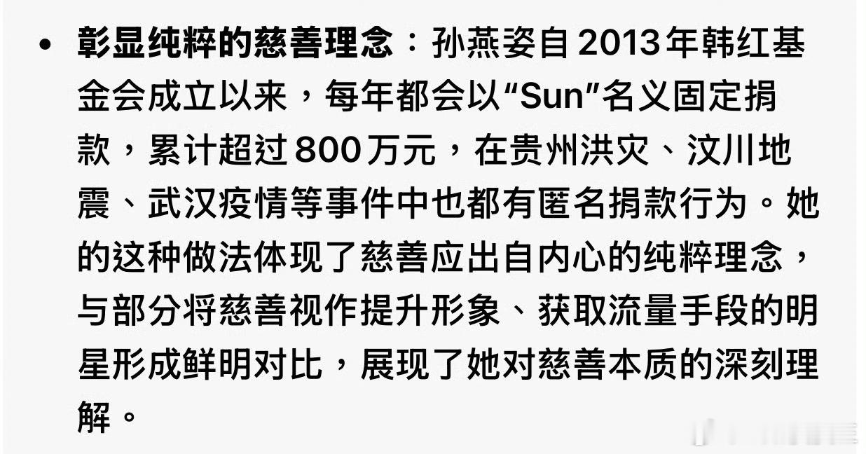 另外,孙燕姿平时为人处世低调,鲜有绯闻,也不炒作。曾在最巅峰时期几次暂时隐退,恋爱结婚生子,走得每一步都相当低调,认真生活,同时还默默做着公益,以自身的影响力与能力,去影响与帮助更多的人。