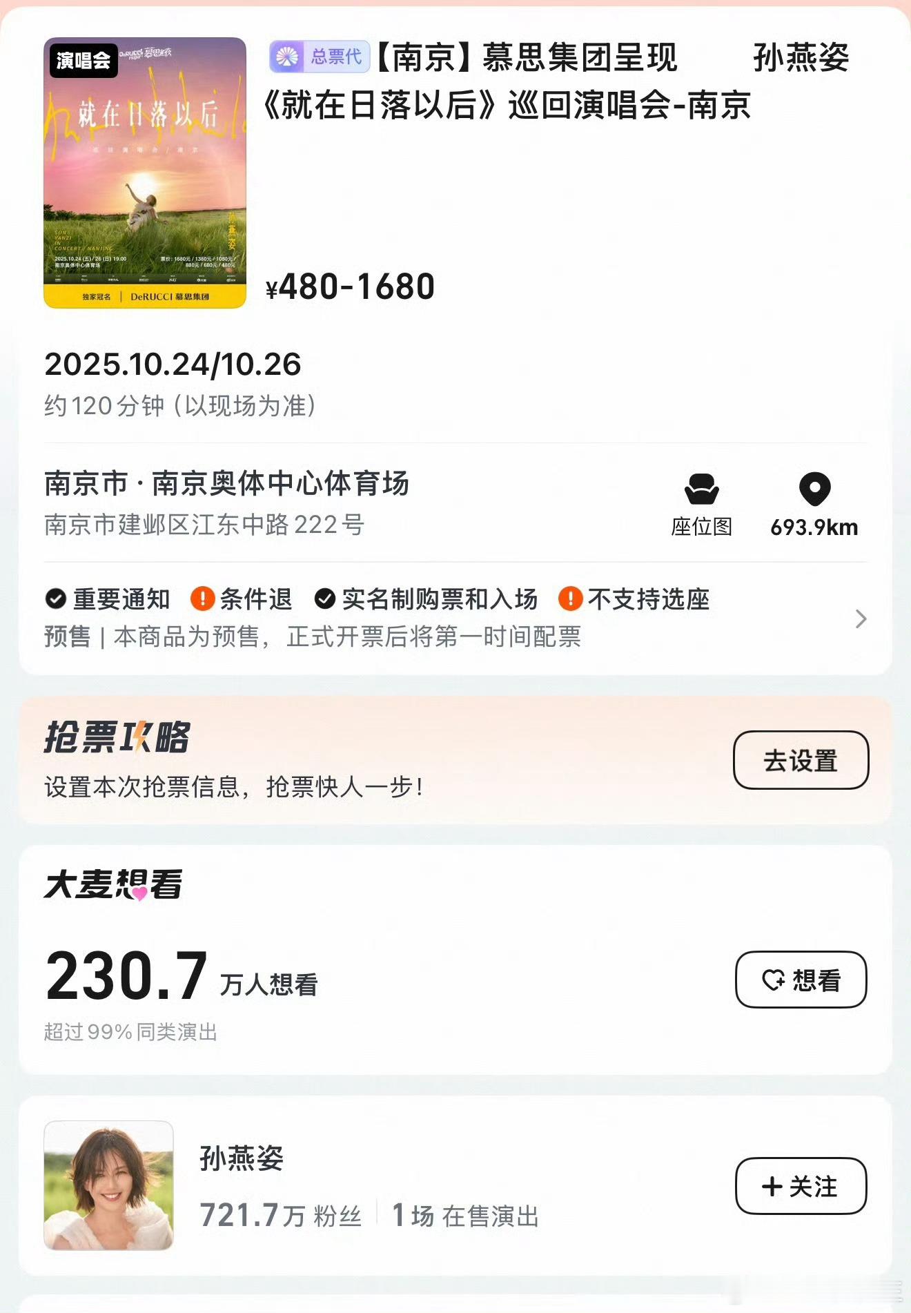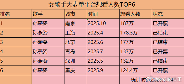 出道至今,金曲无数,歌曲保值度惊人,体育场巡演场场爆满,每一个城市的想看人数均破100万,南京场更是突破200w,演唱会号召力在整个女歌手里稳居TOP3,同时,在各大音乐平台上,孙燕姿线上试听量也长期稳居华语女歌手里的第一梯队。
