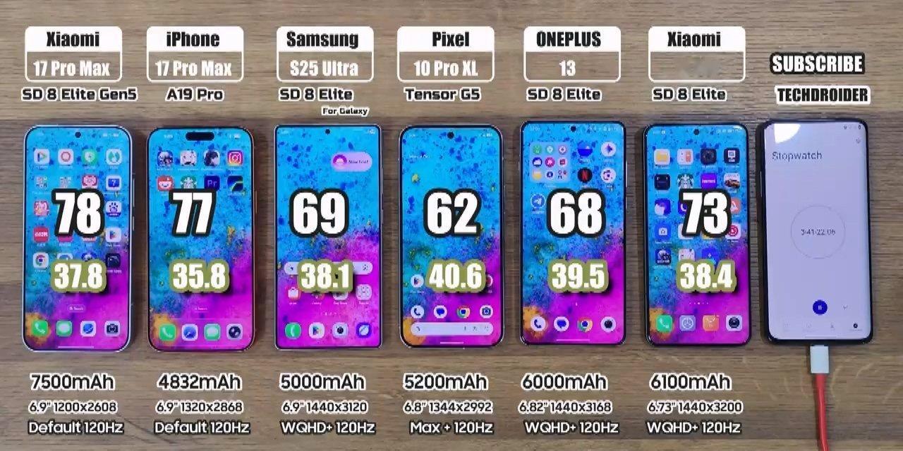 YouTube 频道 TechDroider 发布最新视频,对比了小米 17 Pro Max、苹果 iPhone 17 Pro Max、三星 Galaxy S25 Ultra、小米 15 Pro、一加 13、谷歌 Pixel 10 Pro XL(顺序按照视频描述)这 6 款手机的续航能力。