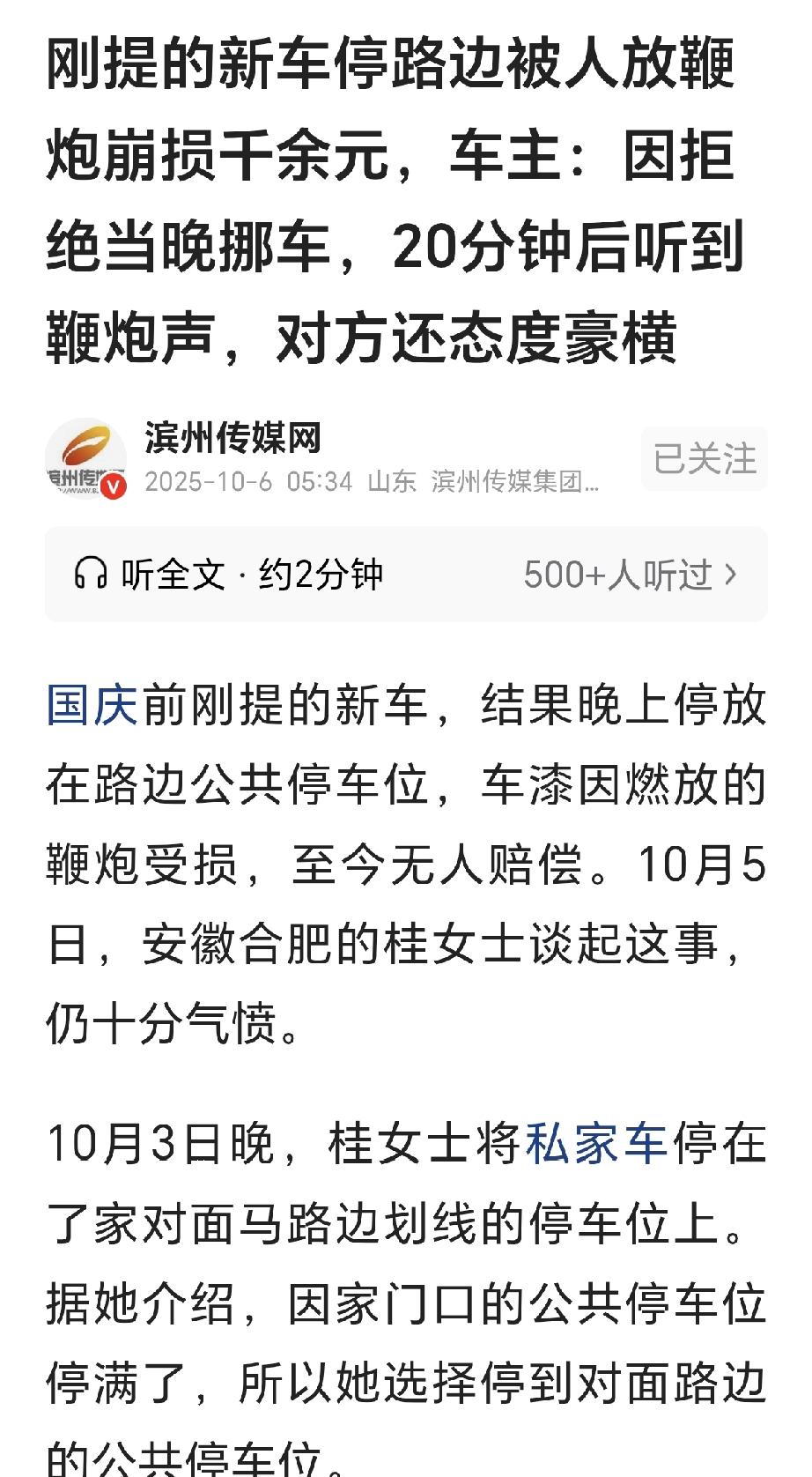 刚提的新车,还没来得及贴膜,就被人用鞭炮炸出了划痕。安徽合肥的桂女士,遇上了今年最离谱的“停车纠纷”。她把车停在划线的公共车位上,没挡道、没越线,却在晚上10点被人要求挪车。她拒绝后,对方便在她车旁放鞭炮,导致新车车漆多处受损。报警后,对方不道歉、不赔钱,反而态度蛮横。桂女士心疼又气愤:“我车停得规规矩矩,凭什么被人‘炸车’?” 在10月3日晚。桂女士那天回家较晚,家门口的停车位早已停满,她绕了几圈,在马路对面找到一个划线停车位。停车前,她特地下车查看,确认自己停在白线内,周围没有挡住人行道或店门。她心想,既然是公共停车位,停着理直气壮。她锁车回家,洗漱完准备睡觉时,接到了一个陌生电话。 电话那头的女子语气生硬:“你这车挡着了,赶紧下来挪一下。”桂女士有些懵,解释说自己停在划线内,没有妨碍通行。对方坚持让她立刻挪车,她无奈回应:“现在太晚了,明早我再挪。”挂断电话后,桂女士没再理会。 谁料二十分钟后,手机突然发出刺耳警报。她的汽车哨兵模式提示“有异常靠近”,紧接着传来“噼里啪啦”的鞭炮声。她心头一紧,飞奔下楼,结果看到一名女子正站在她的新车旁,脚边散落着一地红色鞭炮残屑。车身漆面被火星溅得斑驳,部分部位已经脱色。 桂女士当场报警。警察赶到后调取监控,视频清晰显示对方在车边燃放鞭炮。面对质问,对方却理直气壮地说:“放鞭炮是我自己的事,又没碰她车。”警方进行调解,对方依然拒不道歉。 第二天,桂女士把车送去4S店定损,维修费用高达一千多元。她心疼不已,这车才买几天,连首保都没做。她在社交平台上发出视频,请网友评理。 网友炸锅了——有人说桂女士停车合法,鞭炮女的行为简直“无法无天”;也有人猜测,她是不是挡了别人家门口。但根据视频和现场照片,车确实停在公共停车位内,白线清晰、路面整洁,既不影响出入,也不是私家地。仅凭“你挡着我心情”就要求别人挪车,再用鞭炮发泄,这种行为显然超越了道德和法律的底线。 从法律角度看,桂女士的停车行为完全合法。根据《道路交通安全法》第63条规定,机动车应在划定的停车泊位内停放,不得影响其他车辆、行人通行。桂女士停在划线车位内,未超出边界,也未阻碍通行,不存在违法停车。而对方在车边燃放鞭炮,导致车辆受损,已构成故意损害他人财产。 根据《民法典》第238条:侵害他人物权造成损害的,权利人可以依法请求损害赔偿。桂女士的新车车漆受损,损失明确、可评估,对方应承担赔偿责任。这种行为不仅违反民法,更触及《治安管理处罚法》第49条:故意损毁公私财物的,处五日以上十日以下拘留,可并处五百元以下罚款;情节严重的,处十日以上十五日以下拘留,并处一千元以下罚款。燃放鞭炮看似“小事”,但在车旁近距离燃放,属于危险行为,造成实际损坏,性质已经不轻。 如果桂女士坚持追责,警方完全可以依据该条款予以行政处罚。而如果损失金额更大、达到刑事立案标准(一般为5000元以上),则可能涉嫌《刑法》第275条规定的“故意毁坏财物罪”。 很多人以为“放个鞭炮”顶多算不文明,可法律上,这其实是一种过错侵权行为。一旦造成他人财产损失,不论出于报复还是玩笑,都必须赔偿。值得注意的是,桂女士还可主张“合理损失”赔偿,包括交通费、误工费、车辆修复期间的代步费用等。侵权责任不仅限于直接损失,而应涵盖因侵权引发的必要支出。 警方调解若无结果,桂女士可凭报警记录、监控视频、定损单据,向法院提起民事诉讼,依法维权。 此案的争议焦点,并不是“车该不该挪”,而是“对方有没有权用极端方式报复”。法律从不禁止沟通,但绝不容忍以破坏行为解决矛盾。公共停车位属于城市公共资源,不归个人或商户私有。哪怕真有不便,也应通过交涉、报警等正当途径处理。擅自燃放鞭炮,不仅可能损坏车辆,还存在安全风险。鞭炮爆炸产生的高温火星,轻则烫伤漆面,重则引发燃烧,危及公共安全。 法律保护的是秩序,而不是情绪。桂女士合法停车,对方却用鞭炮“教训”人,这种做法不仅违法,也极具危险性。邻里纠纷从来不是靠“气势”解决的,而是靠规则约束的。文明社会里,沟通是桥梁,冲动是陷阱。 桂女士的遭遇,也提醒每一位车主:停车要守规,对方若挑衅,别冲动还击,而要用法律武器维权。也提醒那些习惯“用自己那一套解决问题”的人——情绪再大,也不能凌驾于法律之上。毕竟,鞭炮的火星能伤车,冲动的火星,烧掉的却是自己的底线。