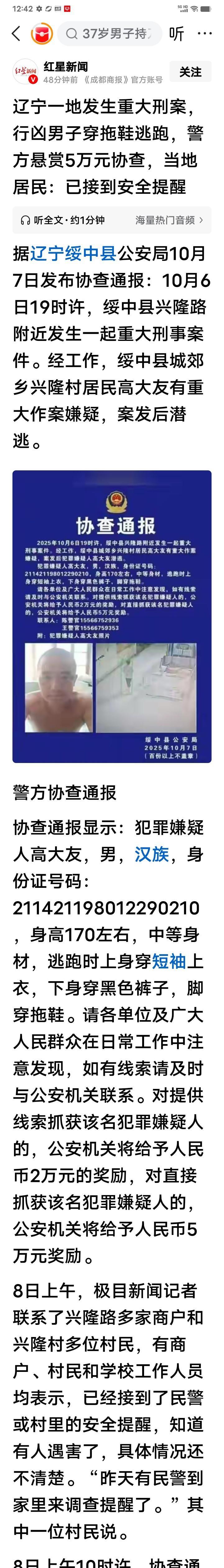 中秋节(10月6日)晚上7点,辽宁绥中县发生重大刑案,已经锁定45岁的嫌疑人。 刑案是发生在家庭成员之间还得仇人之间,还是陌生人之间,警方保密不能说。 我是刑侦电视剧的粉丝,根据我的认知分析一下。 警方说了犯罪嫌疑人逃跑的时候上身穿短袖,脚踩拖鞋。而辽宁现在的温度是8-16度,穿短袖,拖鞋,应该是在自己家,或者亲戚家才能是这装束,所以我分析这场刑案很可能发生在亲人之间,是亲人团聚喝点酒吵架偶发凶案。 警方上来就悬赏5万,这案子不小,或许涉案人员大于二人。 分析水平有限,大家不要当真[祈祷] #秋日生活打卡季#