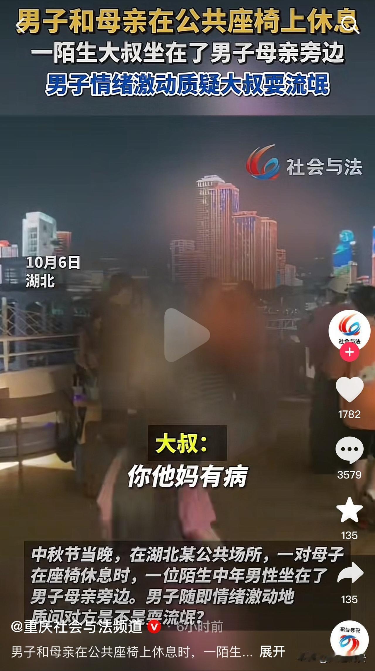 “你往我妈身边坐什么,你有病吧!”10月6日晚,湖北,一男子和母亲在公共椅子上休息,一位陌生大爷坐在了男子母亲身边!随后该男子情绪激动地质问对方:你坐我妈旁边干什么?你是不是耍流氓呢? 该男子带着母亲来到湖北旅游,由于走累了,他们选择路边的椅子上休息。 这时,一位陌生男子也想找个地方休息,就直接坐在了男子母亲的旁边。 该男子见状,直接起身多次大声质问为何坐在他母亲身边,是不是在老太太身边耍流氓呢?你凭什么坐在我妈旁边? 对方也不甘示弱,俩人随即发生肢体冲突。 路边巡警很快赶到,对双方进行劝解,而男子的怒火却一直没有消,多次推搡且质问对方,中秋节为何耍流氓? 后来,随着围观群众越来越多,巡警便把陌生大叔带离了现场,而男子的母亲始终坐在椅子上一言不发。 看完这个视频,我觉得这个男子简直就是不可理喻,甚至觉得他的臆想能力比较强。 他们坐的这个椅子是公共的,而且能坐下三个人,这个大爷或许也是走累了,坐下来休息休息顺带欣赏一下夜晚的美景,他一没语言骚扰,二没动作侵犯,就这样规规矩矩的坐去休息一会,居然就被指责性骚扰,这真是无妄之灾。 咱们通常讲,凡事讲究证据,再没有任何证据的情况下,该男子随意污蔑大爷侵犯他母亲,是要付法律责任的。 朋友们,你们觉得呢?