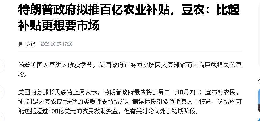 [下雨]特朗普政府打贸易战后,美国大豆因为丢了中国订单,一下陷入了麻烦。特朗普近来想了两个办法解决,结果都没什么用:一是拿收来的关税钱补贴农民,可这钱其实是美国消费者掏的,只能临时救急,补不上失去中国市场的大窟窿;二是派团队去找新买家,但这些国家根本填不上缺口。虽说特朗普打算跟中国谈大豆的事,但这困局本来就是他自己发动贸易战搞出来的。 中国一声不吭就给美国大豆加了关税,本来每年都是美国大豆的最大买家,结果转头找上了巴西和阿根廷,美国这边的订单一下缩水,仓库存货越堆越高,大豆价格也一路走下坡路,很多人都说活不下去了。 特朗普没办法,就想着补点贴,钱虽然是发到了农民手里,可实际上是美国人自己掏的。 新市场他也尝试去开拓,去欧洲、墨西哥、甚至想拉印度进场,可惜这些地方能消化的量跟中国一比就是小打小闹,根本填不上缺口。 全球大豆市场的格局彻底改变。美国往年风光惯了,大豆出口中国是铁打的金饭碗,可关税后,美国被踢出主力名单。 美国农民这边就像失去了主心骨,要说想跳出来靠补贴遮掩市场失血,不过是杯水车薪,不可能靠贴点钱就能抵得住一整个最大买家的“断舍离”。 阿根廷的选边站位,直接让美国的算盘打了空,美国给出200亿的大单援助,条件是要求阿根廷冷落中国。 可阿根廷这边拿了“承诺”,转头就跟中国又延长期了货币互换协议,还把谷物出口的政策专门往中国需求靠齐。 到底是市场订单重要还是表面上的援助更香,阿根廷这回是真给全球上了一课,说明做生意还是要看踏实的订单、不看花哨的政治依附。 回头看美国,贸易战一搅进来看着硬气,实际上火烧到自家后院。美国到处“推销”大豆,欧洲国家增加进口了点,但市场容量摆在那,想顶替中国的巨量根本不现实。 印度自己就是产大豆的大户,保护政策还多,不能全盘接收美国的大豆。 问题迟迟得不到解决,美国不少农民只能转种其他作物,但玉米和小麦的市场同样饱和,生计还是举步维艰,甚至不少老农场坚持不下卖了地。 美国反思起来才发现,太靠单一买家就是巨大的风险。贸易说白了就是“谁能消化得了这个量,谁就能主导市场”。中国作为全球吞噬能力最强的买家,从最开始就获得了主动权 贸易战也让美国农产品在国际市场上的竞争力被巴西和阿根廷彻底拉开差距,人家种植面积和产量一年比一年猛增,出口手续和物流也越来越符合中国这种超级买家的胃口。 而美国则是在关税和补贴的反复循环里越陷越深,大豆出口市场份额一下子从全球领先掉到了不到两成,替代客户撑不起这庞大的产能。 贸易战和补贴的两面夹击下,美国农业如今极为被动,想通过短期操作扭转全球供应链规律,直接后果就是别人很快填补空白,自己却损失惨重。。 全球供应链本就是跟着需求走,谁能给实在的市场,谁就占据主导,靠临时救火和外交施压,根本稳不了生意,也救不回被巴西和阿根廷一分再分的市场份额。