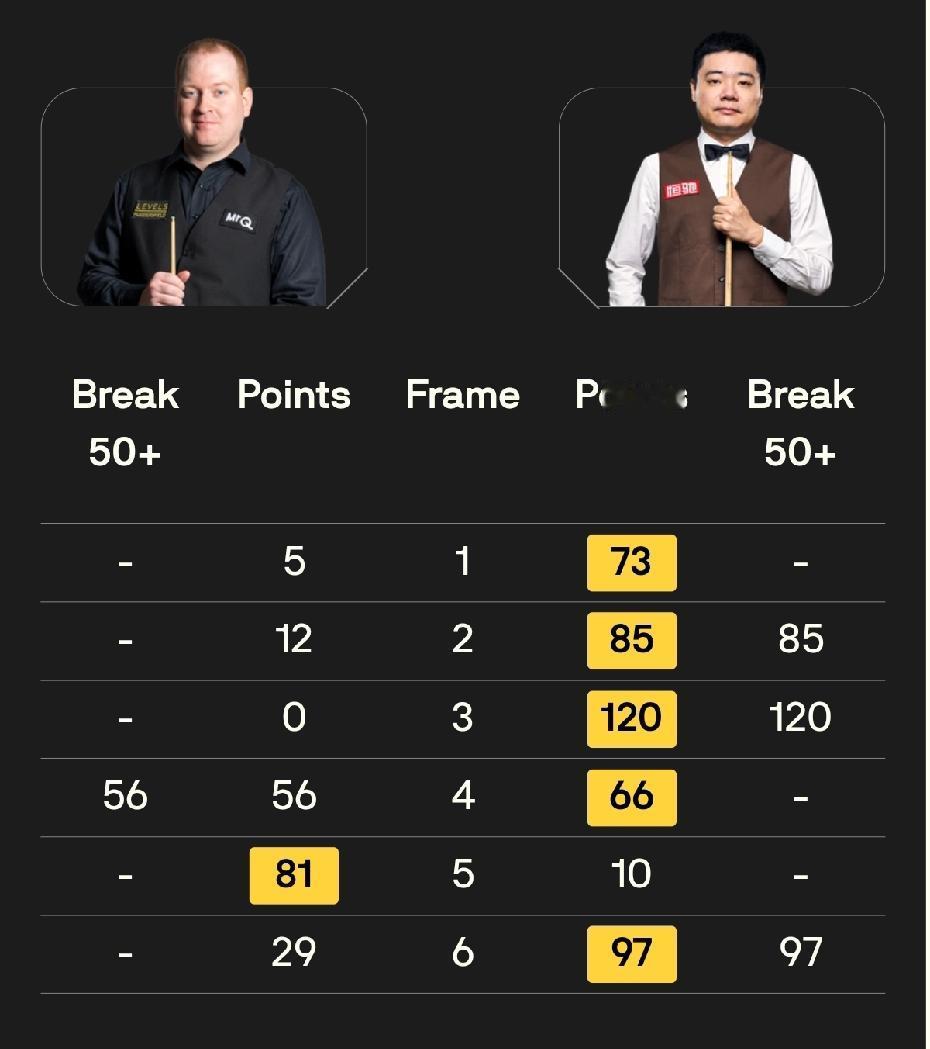 西安大奖赛战报,丁俊晖、吴宜泽晋级32强,张浩出局;世界第一、上届亚军特鲁姆普4-5被史蒂文斯绝杀出局。 丁俊晖5-1大胜乔丹·布朗,其中第3局,丁俊晖尝试打147,在收彩阶段黄球不进,打了120分。第4局,丁俊晖66-56单局逆转。 乔丹·布朗实力不算太强,自从获得北爱尔兰公开赛冠军后,这几年一直走下坡路。 吴宜泽在与徐思打成2-2之后连赢3局,5-2获胜,其中两杆破百、两杆70+、1杆80+。 外选手张浩2-5负于巴拉诺夫斯基。实力原因,张浩晋级正赛,已经完成了任务。 今天下午时段的比赛,上届亚军、世界第一特鲁姆普在3-1领先的大好局面下,遭到“威尔士龙”马修·史蒂文斯顽强反击,史蒂文斯连赢3局。第8局,史蒂文斯68分,已经超了11分,特鲁姆普没有放弃,硬是做了两杆斯诺克,将超分变成延分。最后双方战成68-68,只能通过争黑决胜。争黑没几个回合,小特薄进中袋获胜,双方进入决胜局。 决胜局,史蒂文斯68-0超分获胜。本赛季特鲁姆普表现不佳,状态起伏大,失误偏多。 下午时段其他几场比赛结果是: 斯坦·穆迪5-3胜卡特,加里·威尔逊5-1大胜宋沙瓦。 至此,已有7名中国球员晋级32强,他们争进16强的对阵是: 袁思俊vs凯伦·威尔逊 丁俊晖vs希斯科特 周跃龙vs马克·威廉姆斯 斯佳辉vs威尔斯 吴宜泽vs墨菲 贺国强vs尼尔·罗伯逊/查达 吕昊天vs史蒂文斯 今天19点30分,还有两场中国球员第二轮的比赛,一场是赵心童对米尔金斯,另一场是姚朋成迎战火箭。