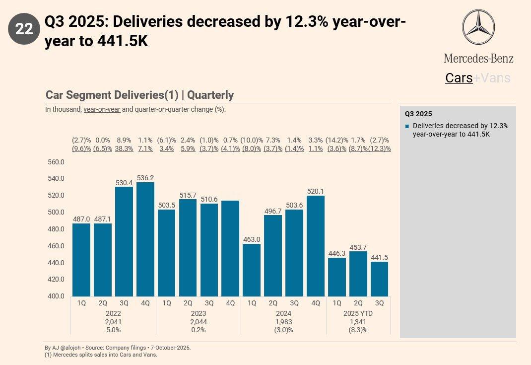 第三季度,奔驰汽车销量同比下降12.3%,特斯拉汽车销量同比增长7.4%。