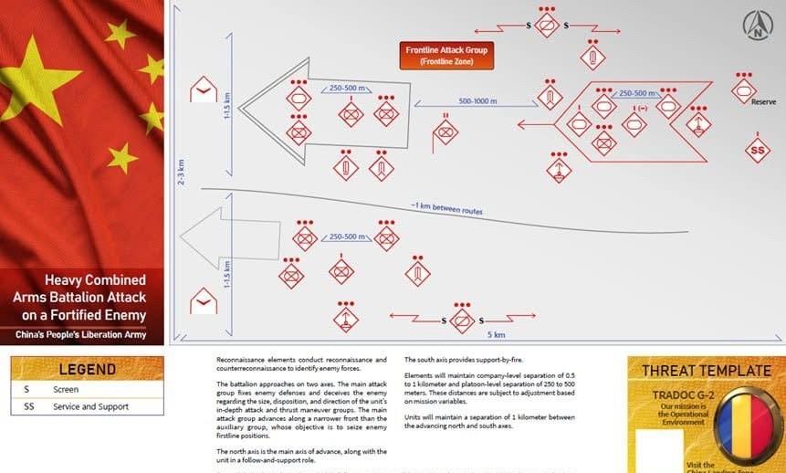 解放军重型合成旅/营/连突破敌方防御工事的战术与作战编组 解放军采用多层次兵力结构协同攻击: 战术特点 打击纵深 前线正面区域宽:2-3 公里。 预备队展开区域:2-3 公里。 驻防及后方支援区域:5-8 公里。 纵深区域:由火力射程决定。