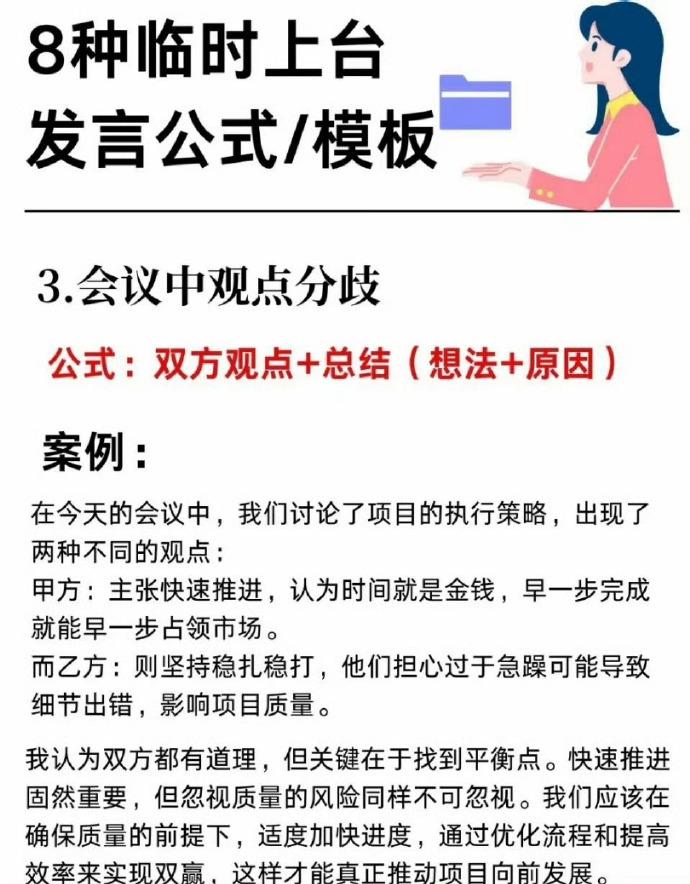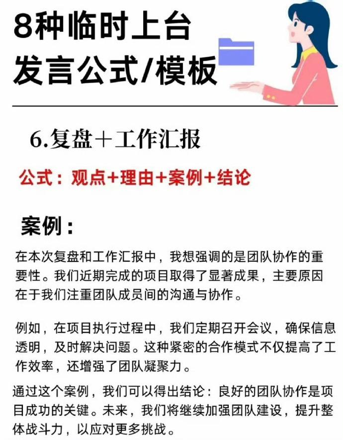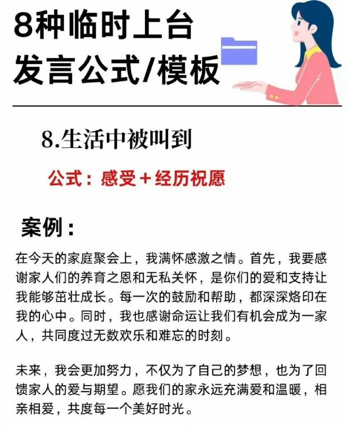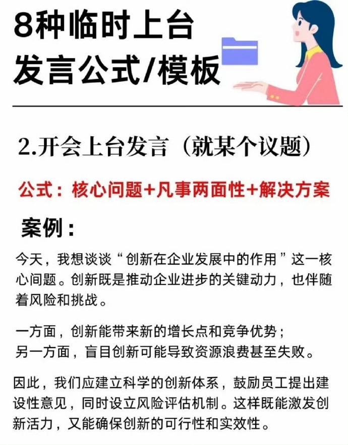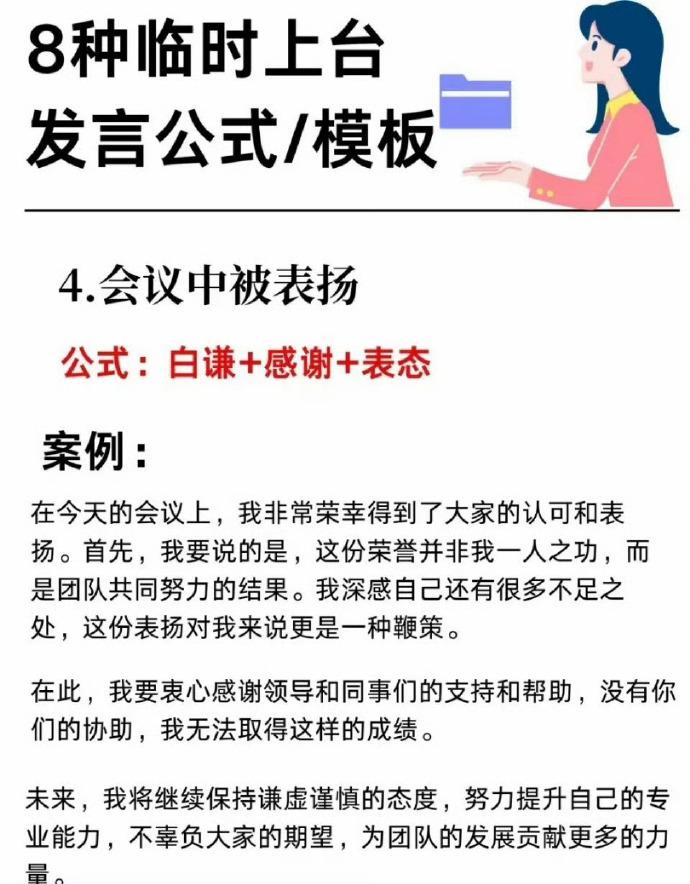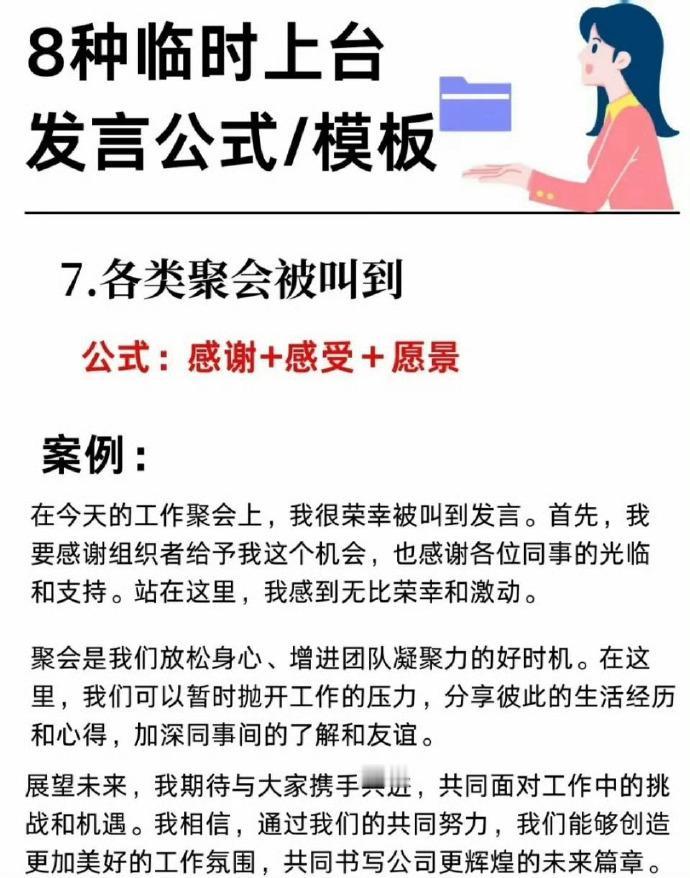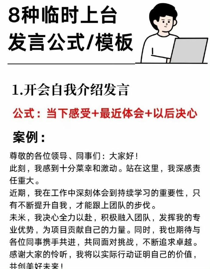 真是工作了十多年才知道,原来工作能力强的人全都擅长上台发言,特别是这8种临时上台发言万能公式,早就倒背如流了。这份即兴演讲万能公式,大家快保存下来,以后公司开会、朋友聚会或者是开会自我介绍发言,都随时能用上,平时多学学即兴演讲万能公式,以后再也不怕当众演讲了。升职加薪,都要比身边人快一步。#寻美三湘##长沙新朋友# 即兴演讲两册 抓住沟通瞬间开口征服他人