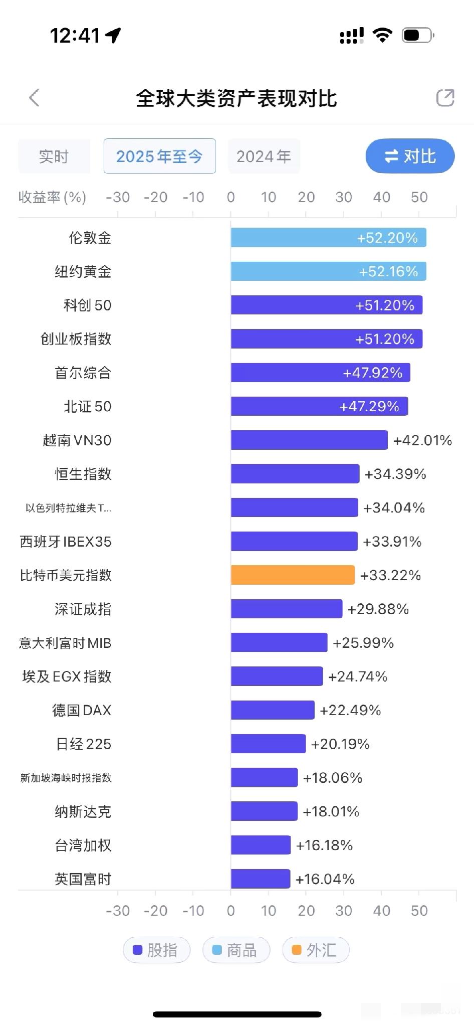 黄金成为今年表现最好的资产。 今天涨完。 黄金正式超越科创50,成为今年全世界
