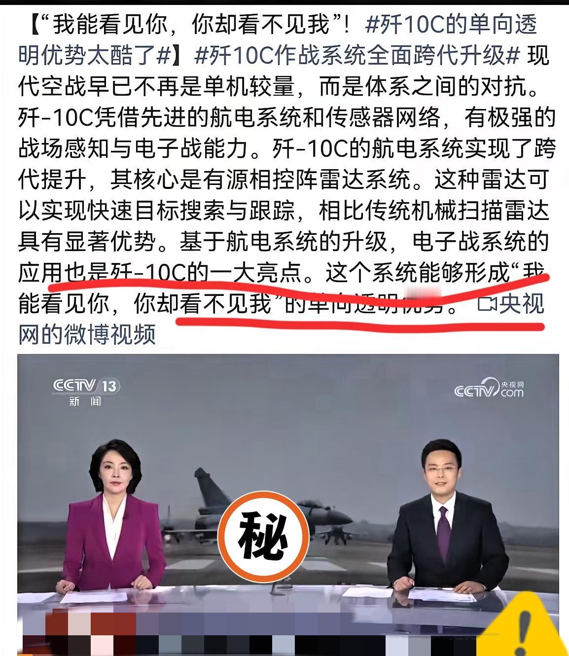 快讯!惊天消息!! 歼10C飞越红海,美军双航母群愣是没察觉,这事儿真不是吹的,央视专访总师王海峰都实锤了! 关键根本不是靠运气,而是咱们玩出了新花样。总师说了,歼10C的航电和电子战系统是跨代升级,能做到“我看见你,你看不见我”[__LINK_ICON]。一般战机带不动大型电子战设备,但咱们靠有源相控阵雷达技术突破,直接把战机和电子战飞机的本事融一块儿了。就像美军咆哮者对付F22那样,靠强干扰和欺骗让对方雷达成摆设,这思路太绝了。 这哪是单机厉害,分明是咱们的技术路线走对了,用体系优势造非对称战力。你们说,这种“藏得住又看得远”的本事,是不是比单纯拼性能更聪明?