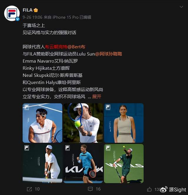 9月22日,FILA正式续约中国网球公开赛并升级为中网独家官方鞋服赞助商,借助中网的高端定位,FILA可进一步巩固运动时尚形象,吸引更多高净值圈层和家庭消费者;同时,FILA宣布中国男子单打第一的职业网球运动员布云朝克特成为品牌中国首位网球代言人,进一步完善旗下的顶级球员矩阵。