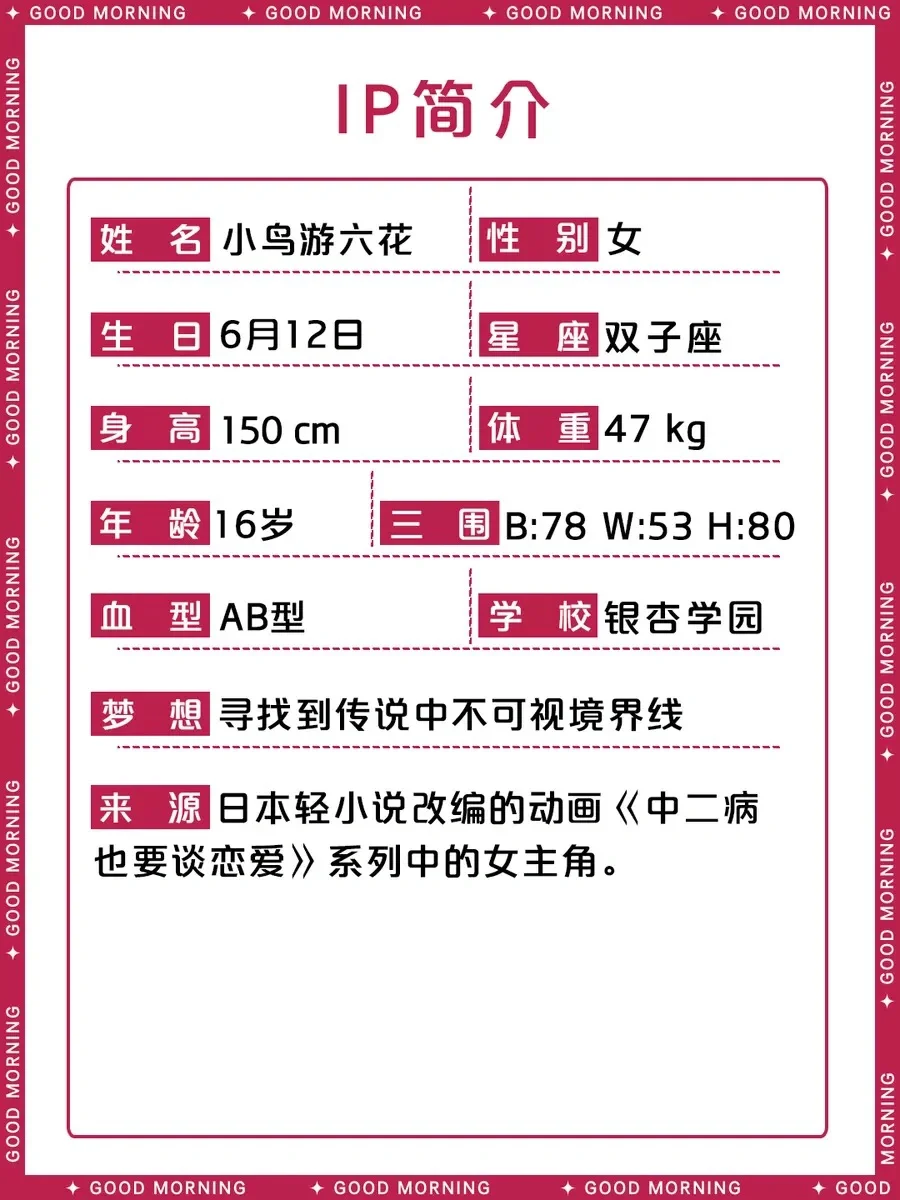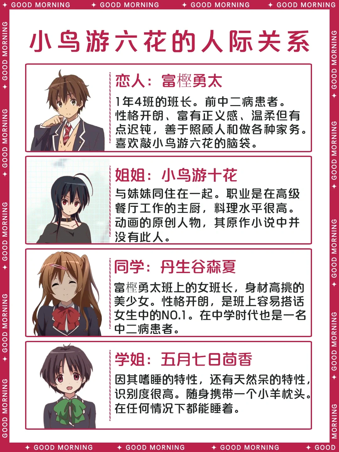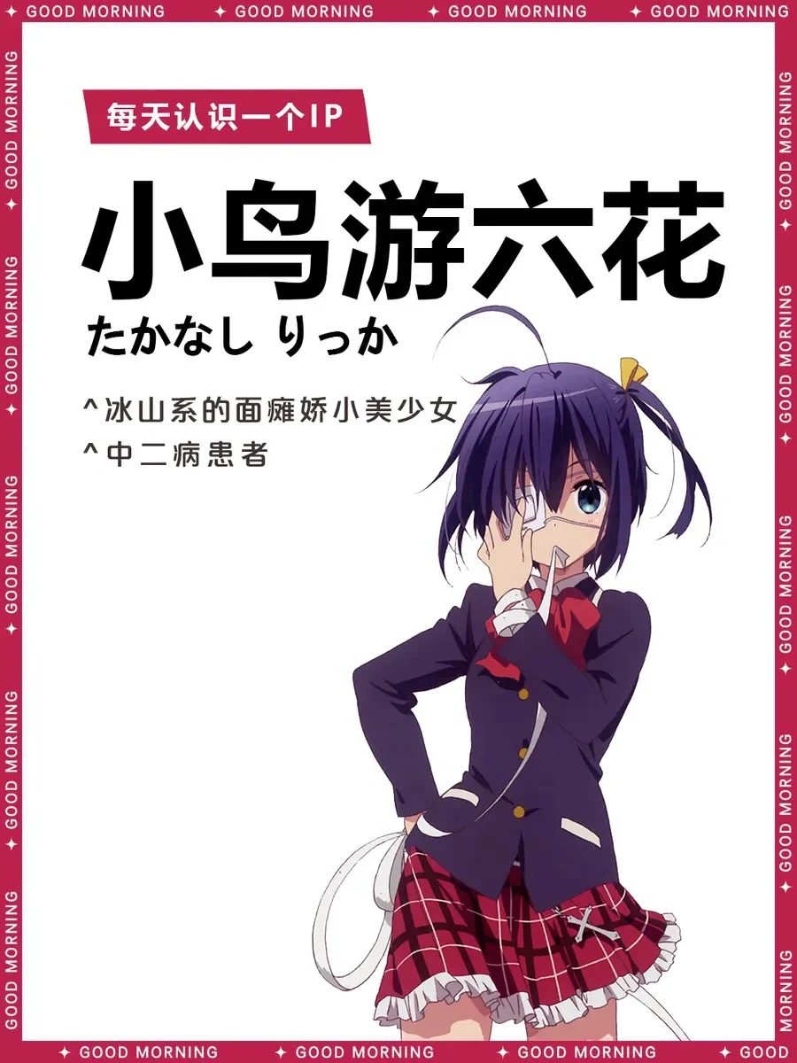 来 源:日本轻小说改编的动画《中二病也要谈恋爱》系列中的女主角。
