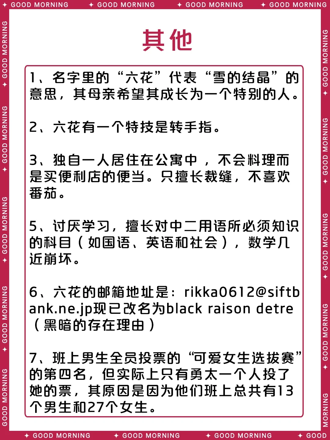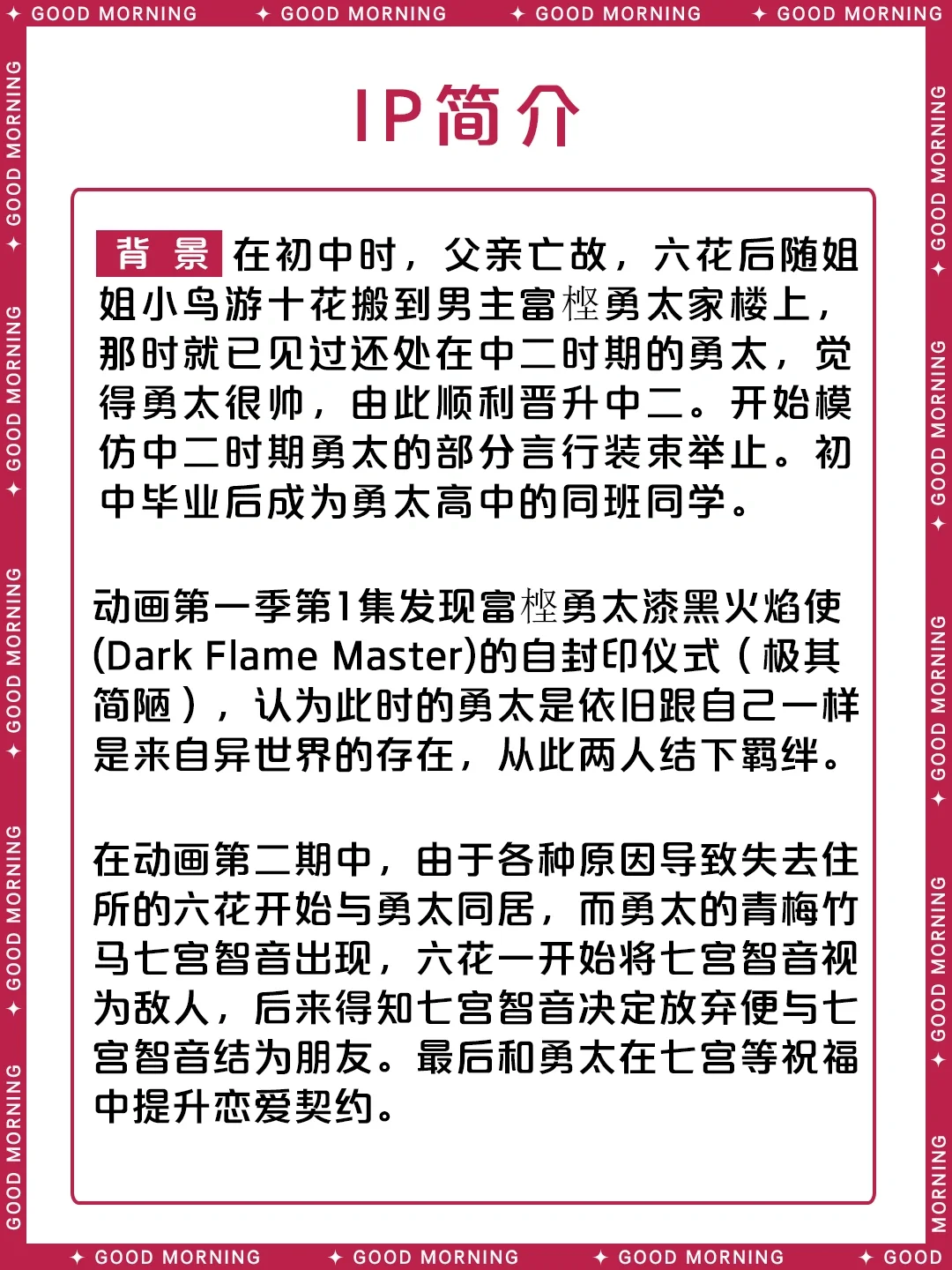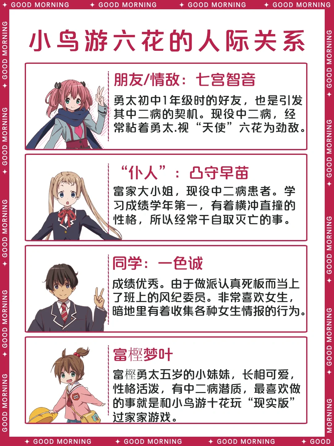 来 源:日本轻小说改编的动画《中二病也要谈恋爱》系列中的女主角。
