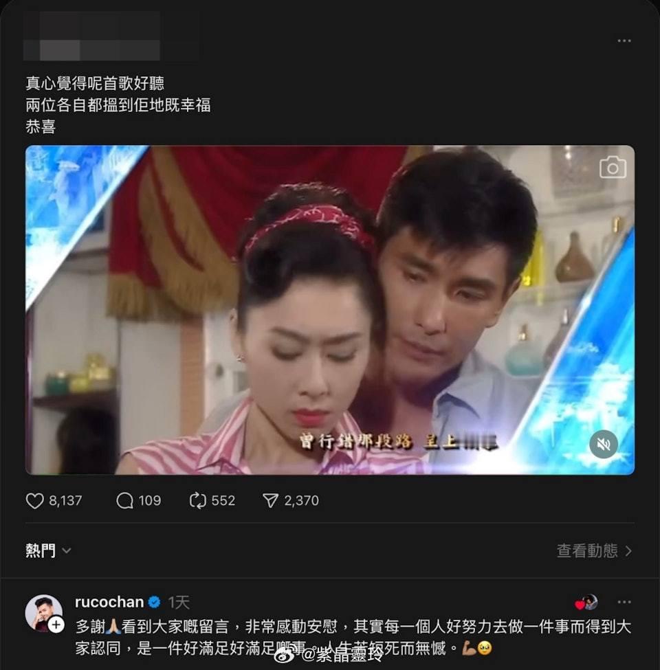 近日有網民在threads分享兩人合唱的《城寨英雄》劇集片尾曲《從未知道你最好》MV,並感性寫道:「真心覺得呢首歌好聽,兩位各自都搵到佢地嘅幸福,恭喜」。沒想到這貼文竟吸引陳展鵬本尊現身,他真情流露回覆:「多謝!看到大家嘅留言,非常感動安慰,其實每一個人好努力去做一件事而得到大家認同,是一件好滿足好滿足嘅事。人生苦短死而無憾。」