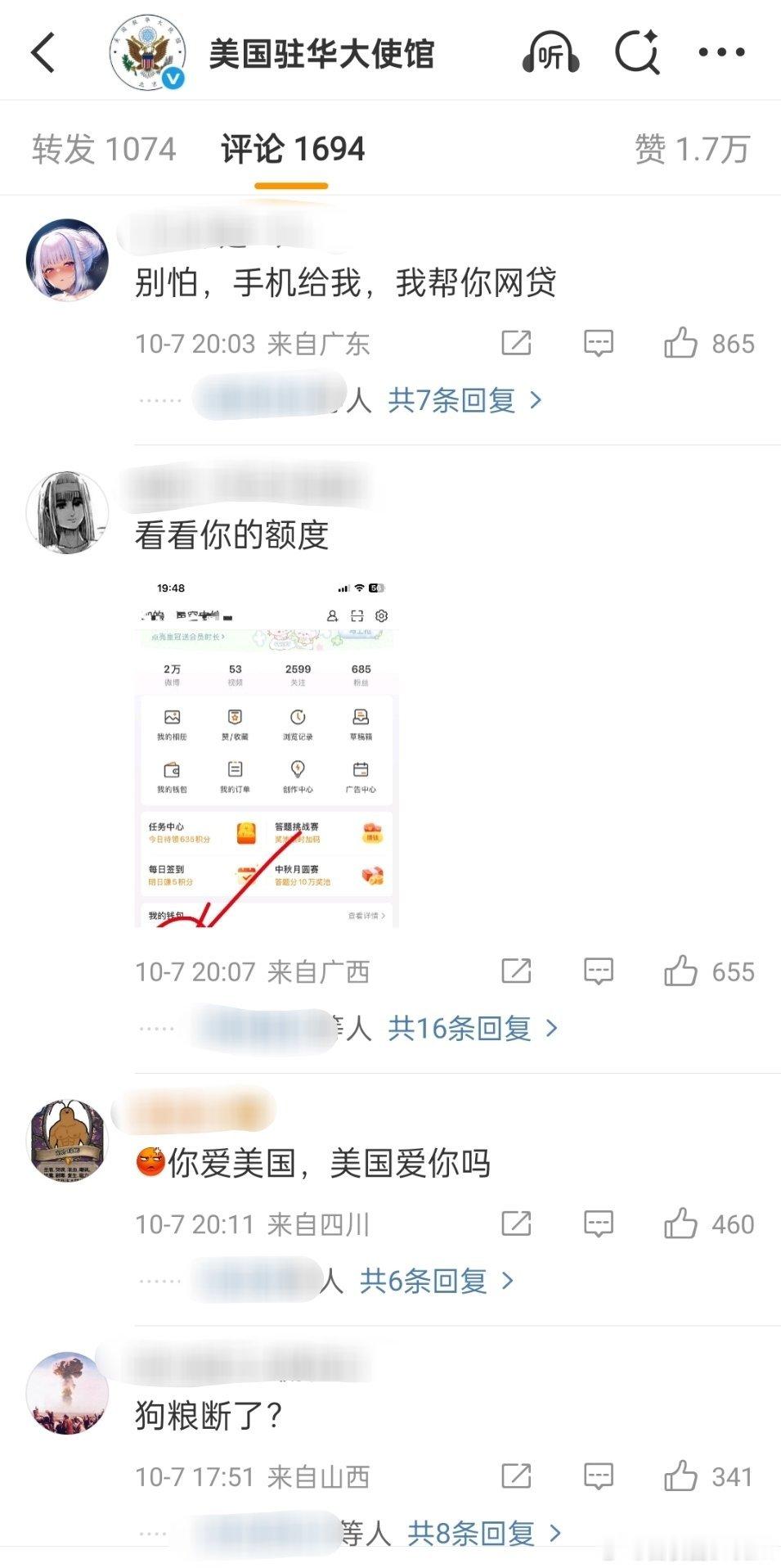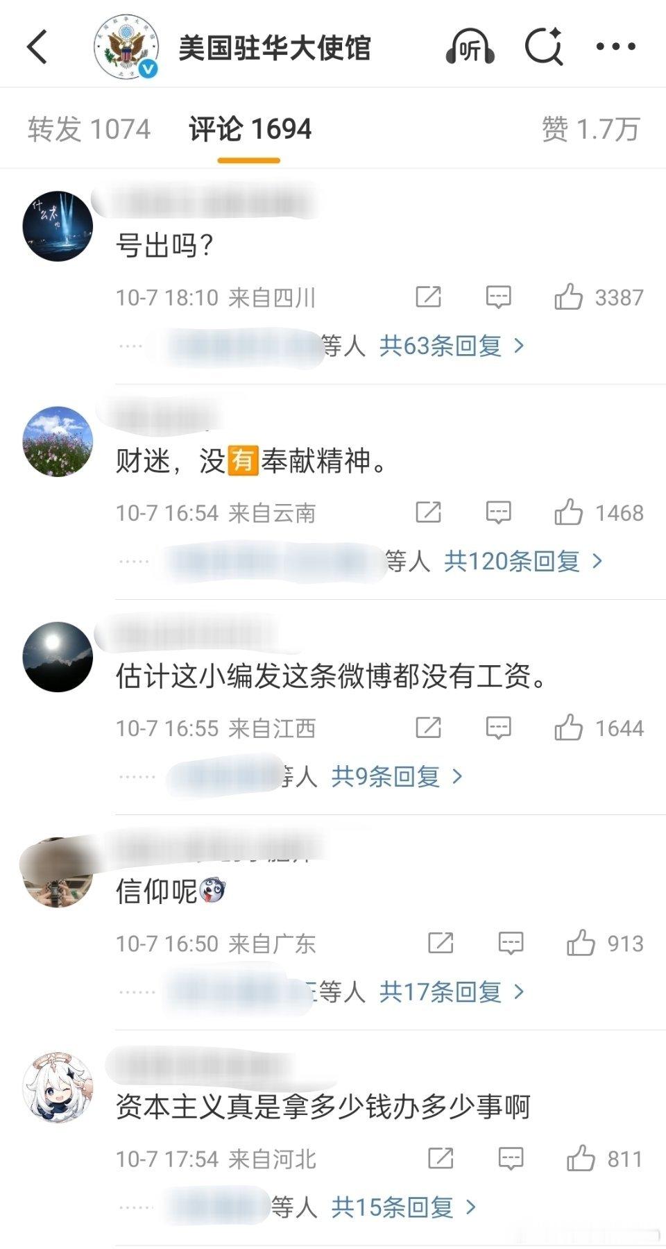 美国驻华大使馆停更微博的评论区已经变成这样了。实在不行小编带货吧,颈椎按摩仪、电动牙刷、剃须刀、人体工学椅安排起来![泪奔][泪奔]