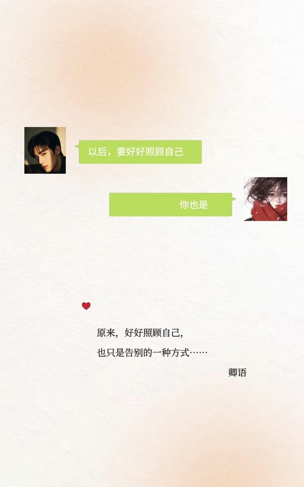 那天他说, 以后, 你要好好照顾自己, 我说你也是, 从此, 我频繁点开的聊天框里, 再也没有出现新的消息, 我知道, 我生活的怎么样,过得好不好, 他根本就不想知道,也并不会再去在意, 你看, 那些被爱情渲染过的句子,只是看起来很美丽, 其实啊,虚伪至极…… 《好好照顾自己》文/卿语 [比心]遇见文字,遇见美好,记得关注哦~
