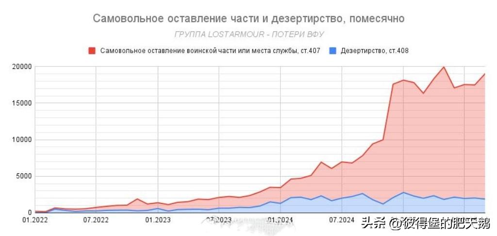 乌克兰检察院有关乌克兰军队内部犯罪统计的最新数据已经公布: 仅2025年1-9月,乌军逃兵人数就高达16万。 和往常一样,lost关注的是逃兵和擅离职守的数据。9 个月内,此类案件的总数已超过 16万起。 lost还制作了擅离职守人数与逃兵人数的比例图表。 目前,平均每1名逃兵对应9名擅离职守人员,而在 2022-2024 年期间,这一比例约为 2:1。这更说明乌克兰指挥部不愿意承认从军队逃跑是逃兵行为,而是将其掩饰为更轻微且所谓的暂时性 “擅离职守”。 #普京称解放近5000平方公里领土# #俄乌冲突##热点观点#