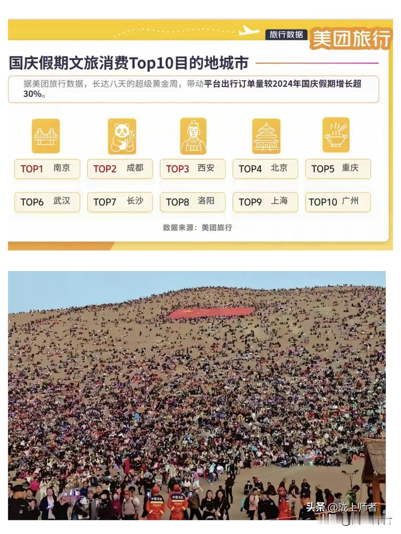 挤满甘肃敦煌鸣沙山沙丘的这么多游客竟然没有带动敦煌进入国庆中秋假期文旅消费前十城。 甘肃的旅游热门城市兰州、天水也没有上榜。看来甘肃文旅消费还有很大提升发展空间。 2025年进入全国国庆中秋假期文旅消费前十名的处洛阳市,剩余的9个城市全都是国内一线大城市。