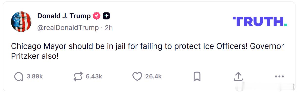 特朗普在官方社群平台Truth Social发文称:“芝加哥市长无法保护美国移民和海关执法局(ICE)官员,应该入狱!州长普里茨克也是!”