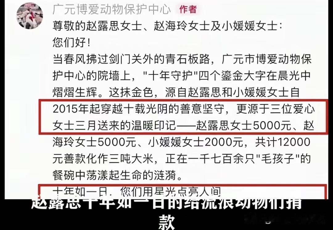 赵露思:出道九年公益十年,内娱真·小太阳 公益做了整整十年,这事儿扒都扒不完。 当别的明星还在舆论里被质疑时,她悄悄悄张掖张掖妇联感谢信,帮当地留守妇女、宝妈和残障人士解决就业,分文不取。前段时间助农也被人质疑,可青川阿姨们的感谢视频骗不了人。 还有广元动物保护中心也说,她十年如一日给流浪动物捐款,从没断过。 一边是有的明星拼命立人设搞营销,她却做好事不留名。粉丝还发现她半夜给急需医药费的爷爷刷520礼物到榜一。 2024年她当巴黎奥运火炬手,政审过关,家庭根正苗红。她没做过坏事,公益做了一箩筐,却老被黑,最近和公司闹僵也没被爆黑料,人品没话说。 对粉丝也真诚,学泰语互动,摘口罩回应远道而来的粉丝,亲手做礼物鼓励患病粉丝,合作过的工作人员都夸她。 虚假小太阳只在粉丝眼里亮,赵露思这颗真·小太阳,经得住所有人评判!