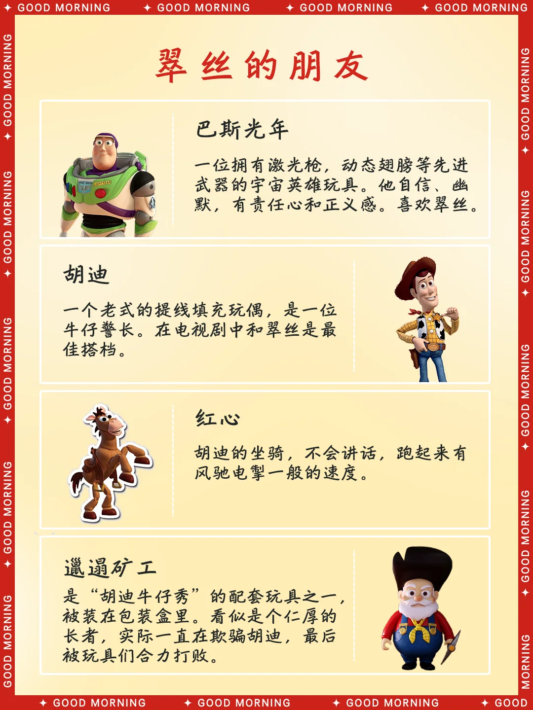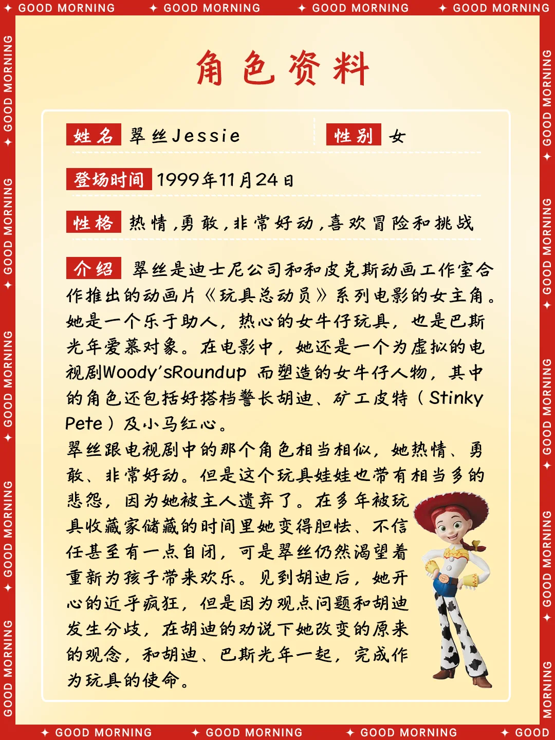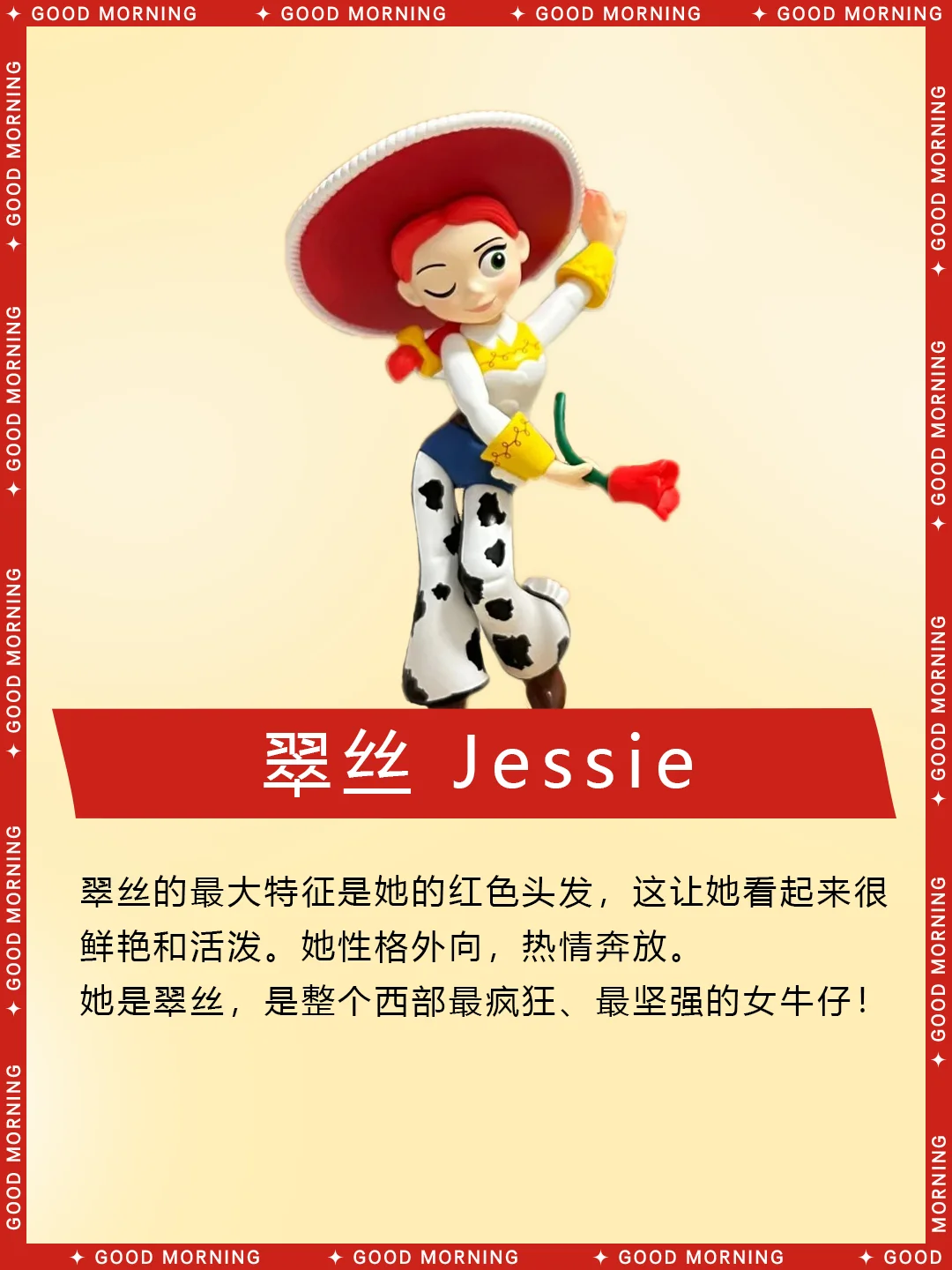 🌼形 象:是一个女牛仔玩具,翠丝的最大特征是她的红色头发,这让她看起来很鲜艳和活泼。