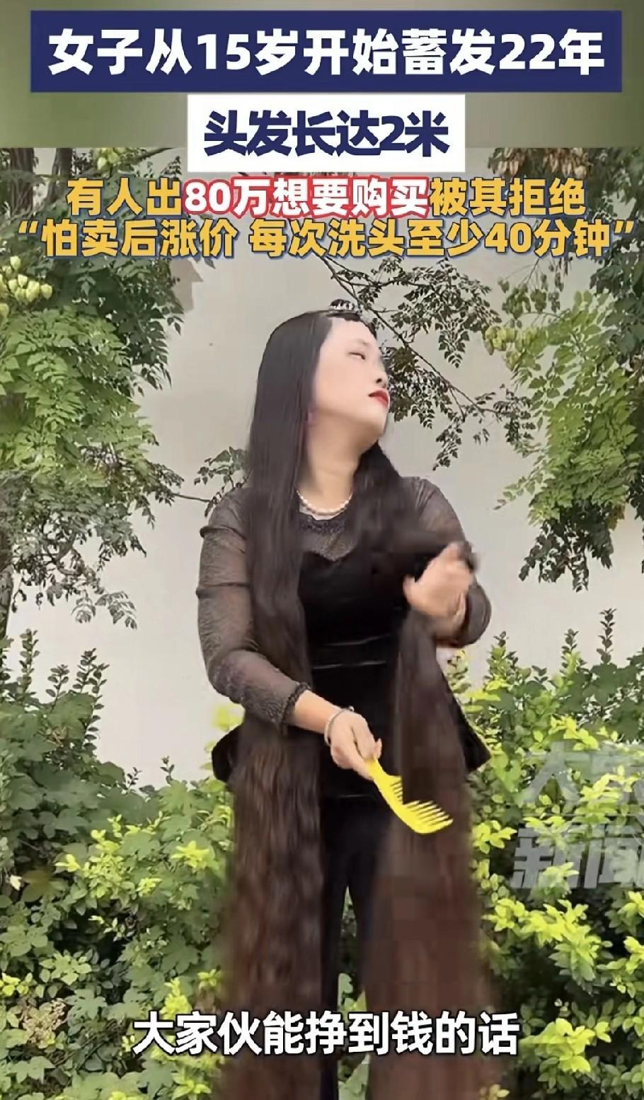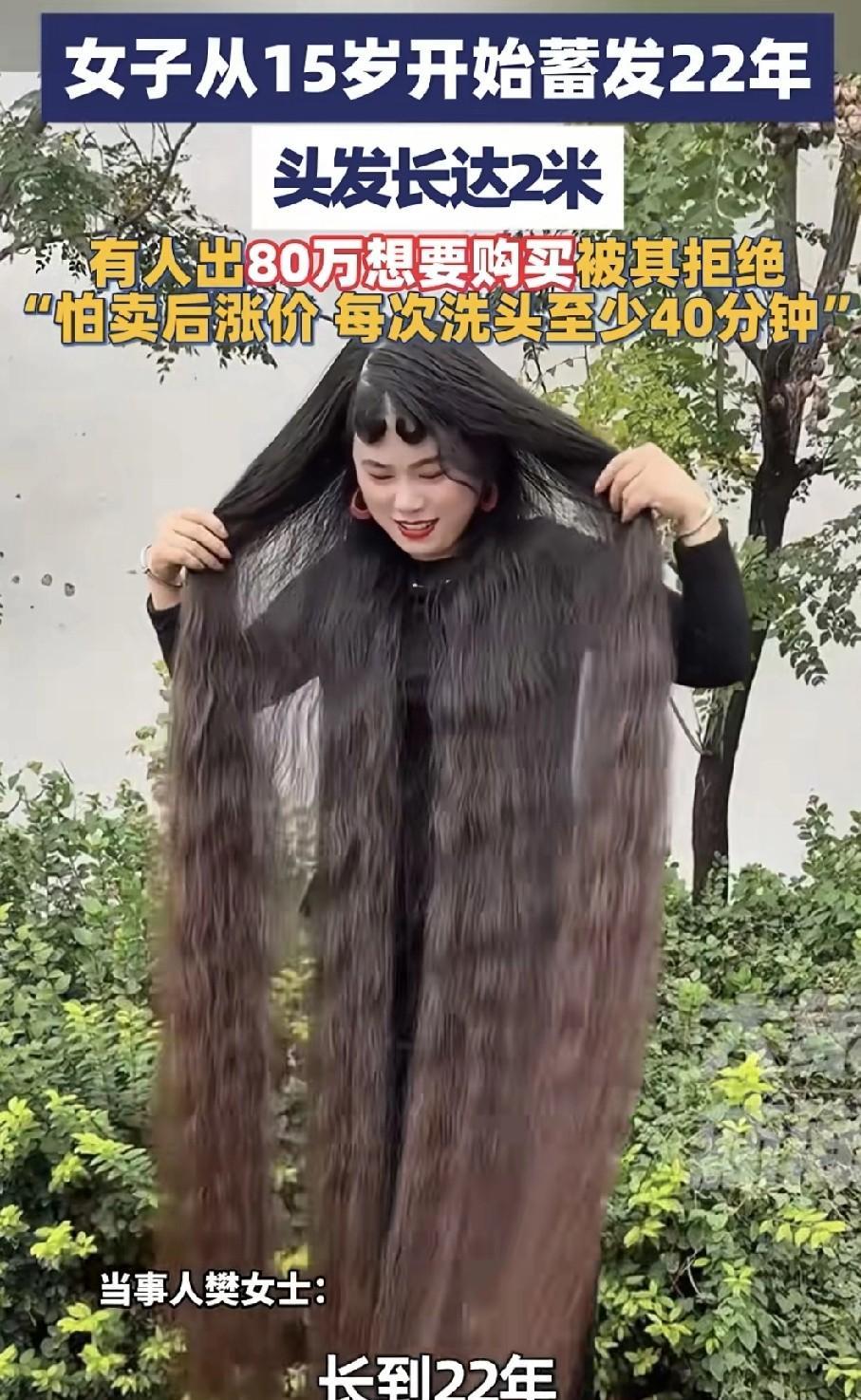 女子15岁开始留长发,22年未曾修剪,如今头发约有2米长。有人出价80万购买,女