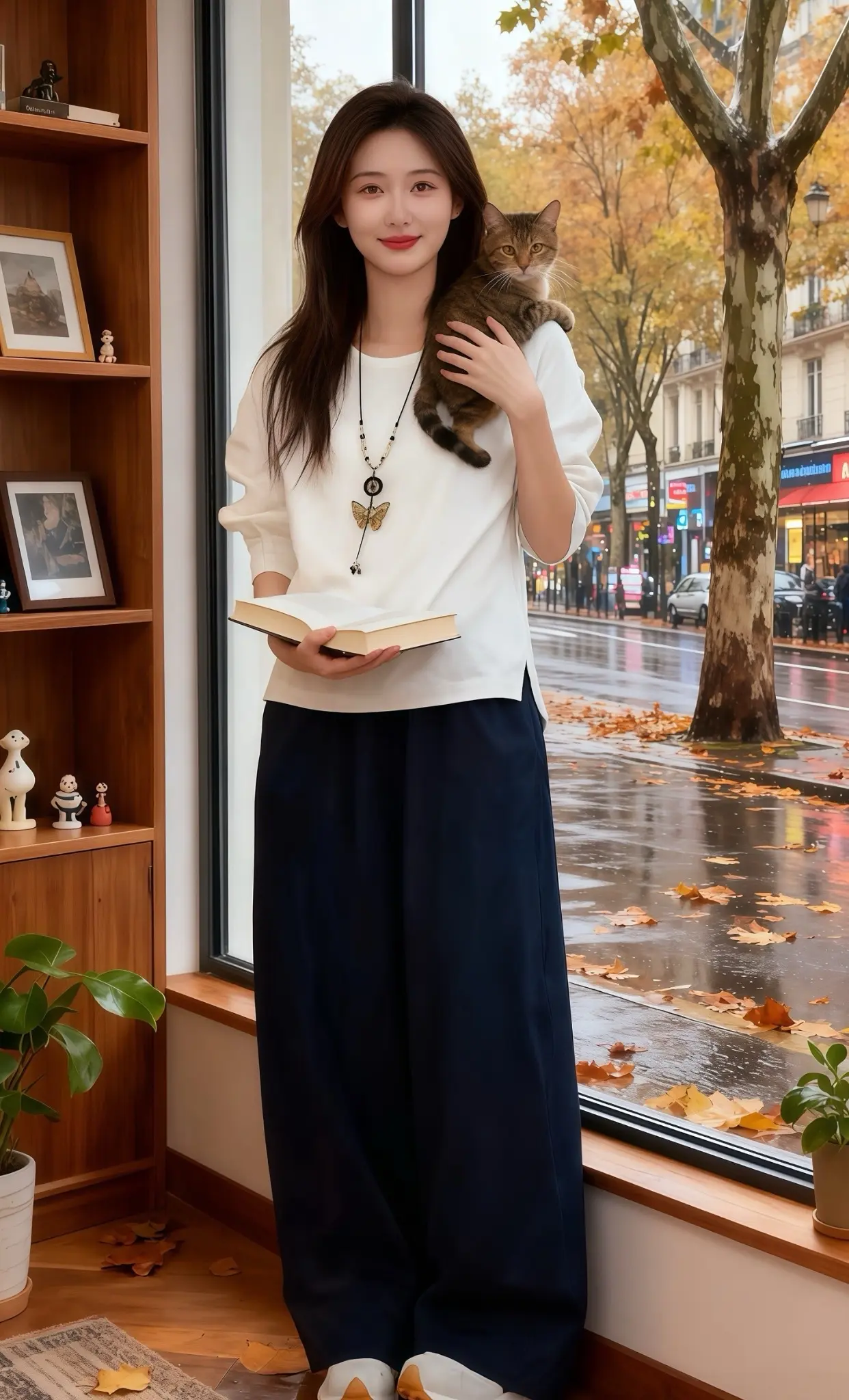 有天,一位客人被她身上的米白上衣和藏蓝阔腿裤吸引,那是她亲手设计的“从容”系列。她笑着介绍:“这布料摸着就像把秋日的风穿在身上。”客人试穿时,窗外的梧桐叶恰好落下一片,贴在玻璃上,像自然送来的配饰。