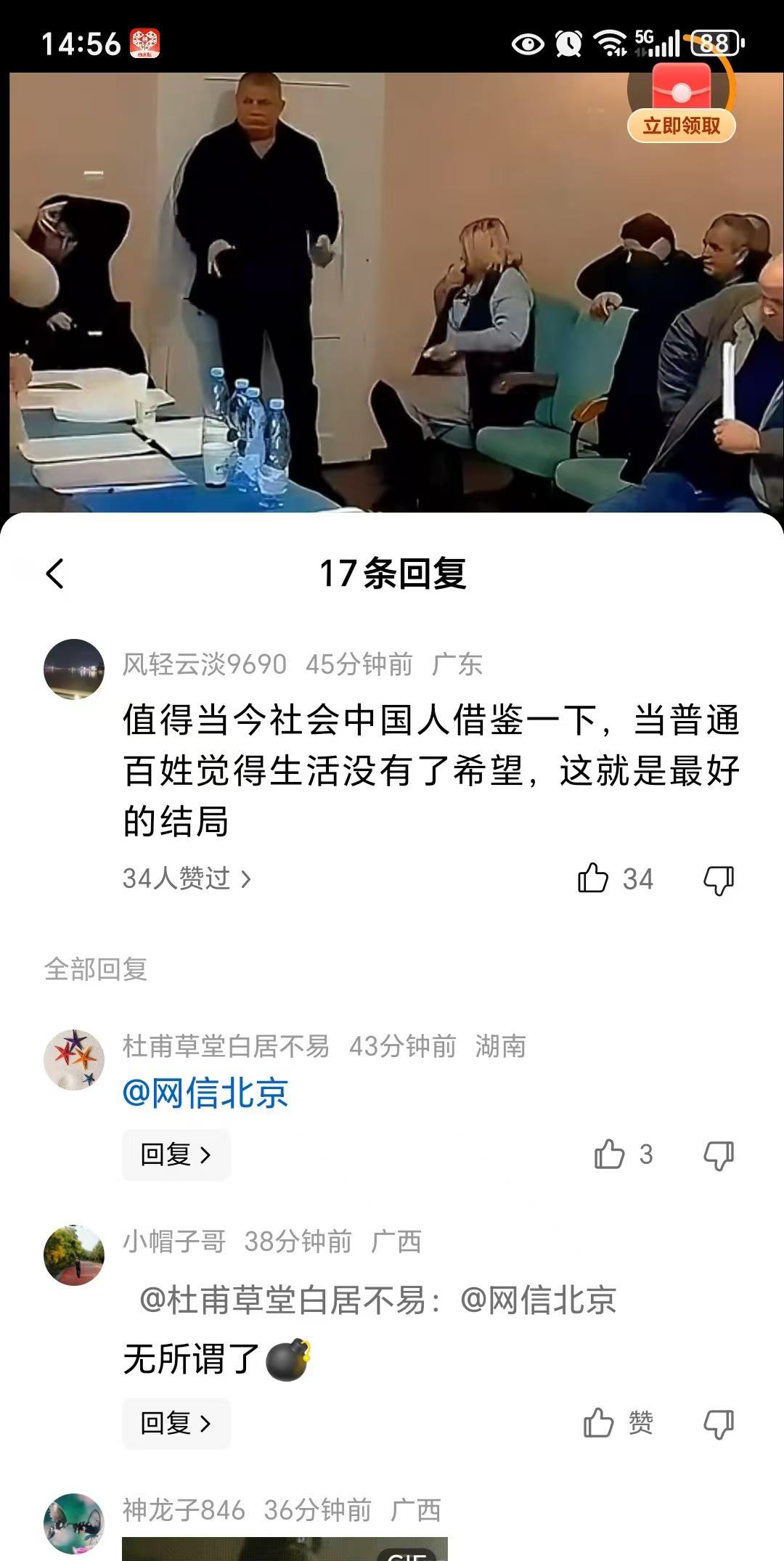 有网友发了一个视频,称一个乌克兰的父亲为了替自己的孩子报仇,使用手雷轰炸征兵办。 这个视频的真假无法判断。 这时竟然有账号丧心病狂的称这值得中国人借鉴,鼓动中国老百姓也这样干。 咱们中国可不像乌克兰,强行把老百姓拉上战场去送死。 中国有不足,也有黑暗面,但是目前中国的法律,特别是网络,让黑暗面惧怕阳光。老百姓既不会遇到视频中那么残忍的遭遇,老百姓的遭遇更是有法可依,最重要的是还有网络,可以获得民意的支持。 这些极端分子,这是在哄骗无辜者去毁灭别人的时候,还要自我毁灭。