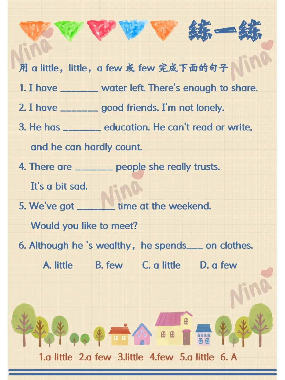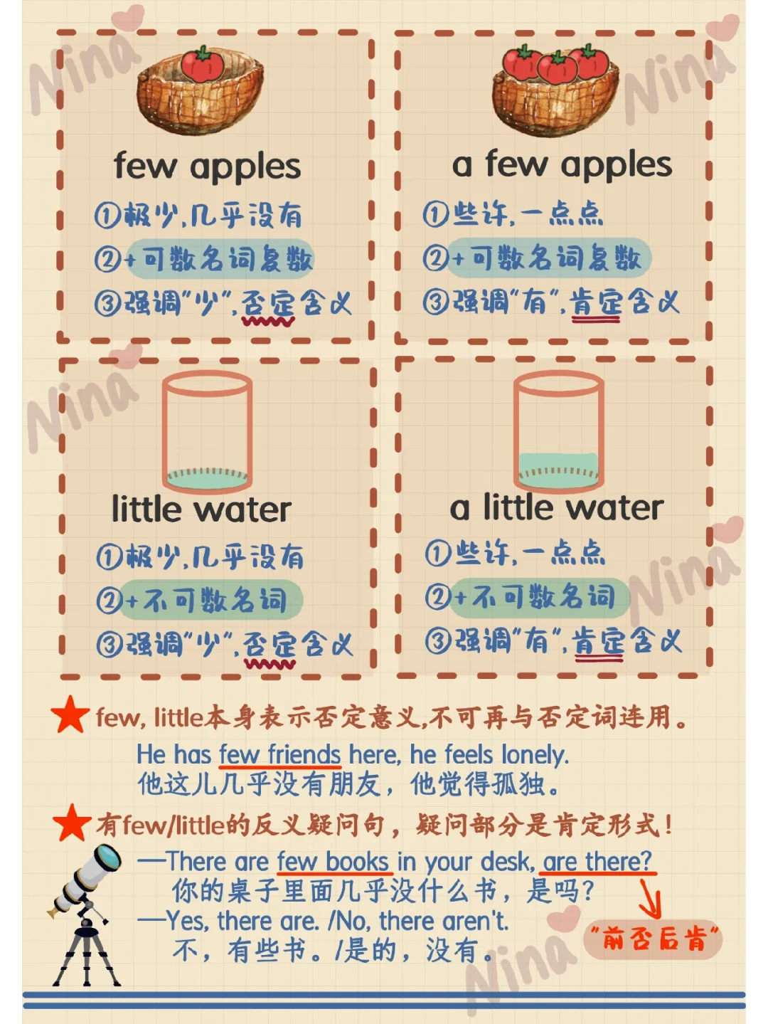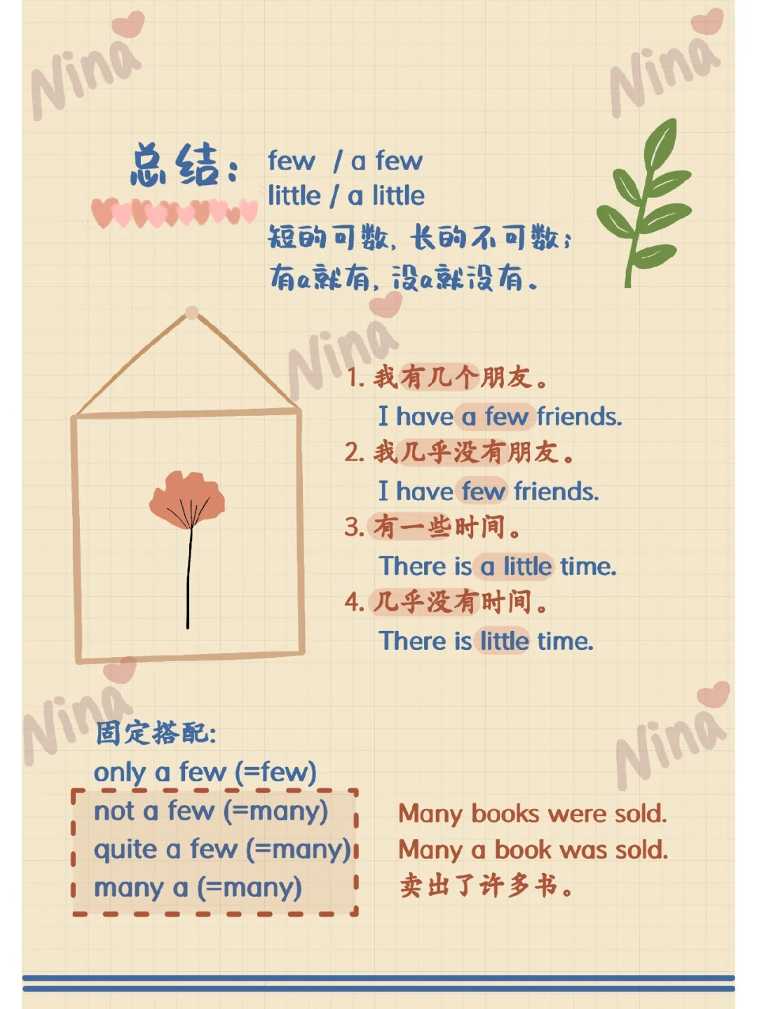 few/a few/little/a little辨析巧记 短可数,长不可数 有a就有,没a就没有 英语笔记 英语语法 专升本英语 初中英语 英语易混词义辨析 爱好:整理知识点📖,做孩子们爱的手账笔记🌵! 分享系统语法知识,从初级到中级再到高级,脱传统语法的枯燥,编写了大量的口诀,由易到难,通俗易懂,赶紧收藏学起来吧。