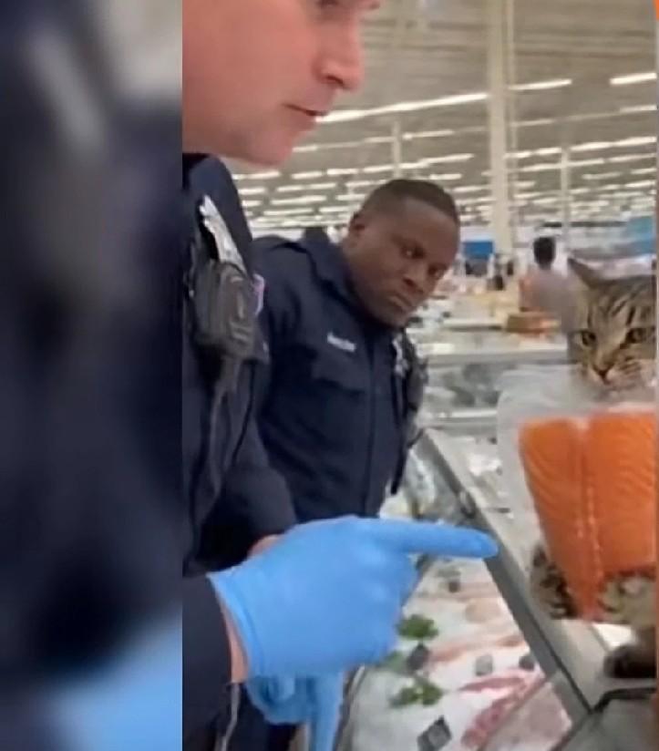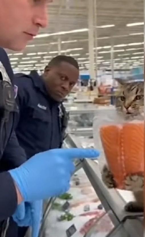 一只被带去美国的中华狸花猫因为吃不惯三明治和汉堡,天天跑到超市偷鱼吃。超市老板赶不走它,无奈选择了报警,警察来到猫咪还抱着偷来的三文鱼不松爪。一名警察用手指着它,让它把鱼放下。猫咪一脸不服气的冲着警察喵喵叫,好像在说:放下我吃什么?咋就只允许人零元购,猫为什么不行?