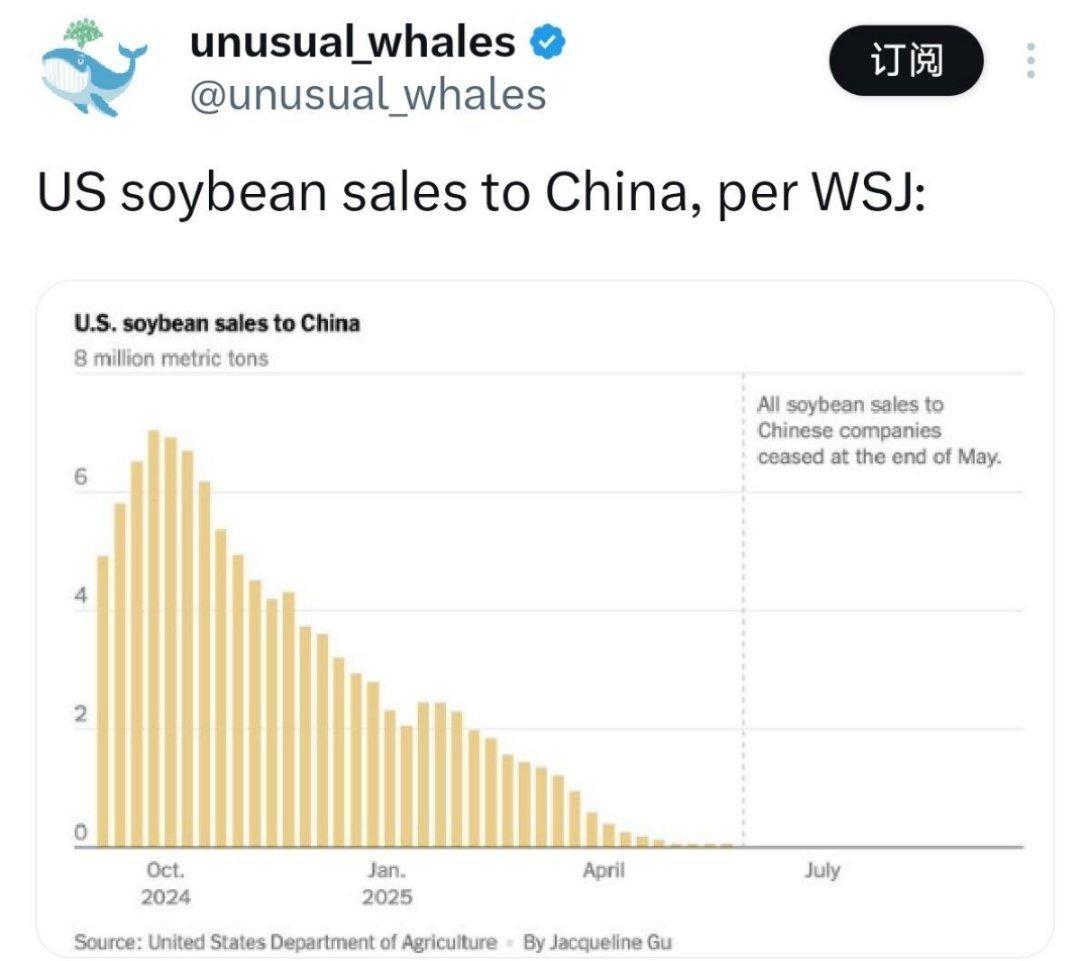 中国说到做到,真的一粒大豆都没买!半年来,中国停止进口美国大豆,美国农民哭惨了! 中国一直是美国大豆的全球最大客户,主要用于生产食用油和牲畜饲料(豆粕),在2024年,中国购买了价值126.4亿美元的大豆,这要占美国大豆出口总额一半以上。但从2025年5月起,中国就没有再购买过一粒美国大豆。中国的订单主要给了巴西,目前巴西大豆已经能够平替美国大豆,巴西大豆已经占据了中大豆进口市场的70%的份额。 在2024年,咱们就进口巴西大豆0.75亿吨,货值365亿美元,这对巴西来说是一笔稳定且可观的巨款。对于中国来说可以替代美国大豆,在中美博弈中占据优势地位。