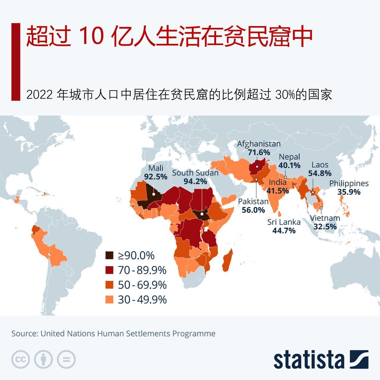 全球有超过 10 亿人生活在城市的贫民窟中 每年 10 月的第一个星期一都是"世界人居日",这一节日旨在反思城镇和城市的现状,以及所有人获得适当住房的权利。预计在未来几十年里,居住在城市地区的居民比例将继续上升:据联合国估计,目前全球 57%的人口居住在城市,但到 2050 年这一比例可能会升至 68%,这是由于亚洲和非洲持续的城市化进程所致。 然而,在这些地区,城市的发展往往是被迫且无规划的,基础设施往往不足或存在缺陷。因此,大部分的城市扩张都发生在贫民窟中,即那些由自建、不卫生的住房构成的区域,那里极度贫困现象十分普遍。 据联合国统计,过去 20 年间,生活在贫民窟的人口数量从 8.95 亿增加到了 11 亿。城市居民最易遭受这些有害生活条件影响的地区是撒哈拉以南非洲和南亚地区,据估计,2022 年这两地区的城市人口中有约 50%居住在贫民窟(而全球这一比例为 23%)。 如下面的地图所示,在一些国家,比如南苏丹(94.2%)、马里(92.5%)或阿富汗(71.6%),这一比例会超过三分之二。巴基斯坦和老挝的城市人口中居住在贫民窟的比例高于 50%。在印度,2022 年城市人口中约有 41.5%居住在贫民窟,而20年前的 2002 年约为55%。