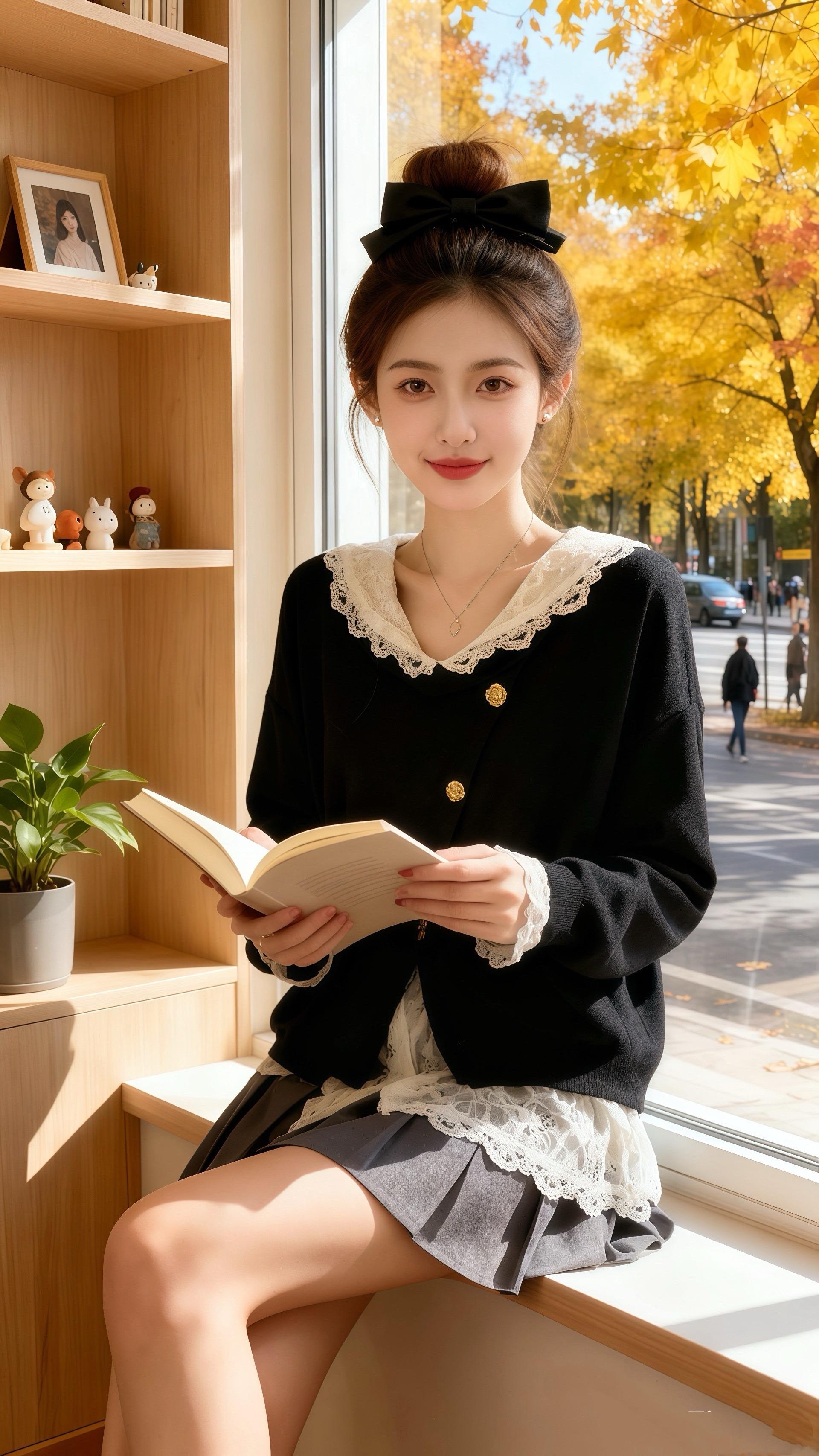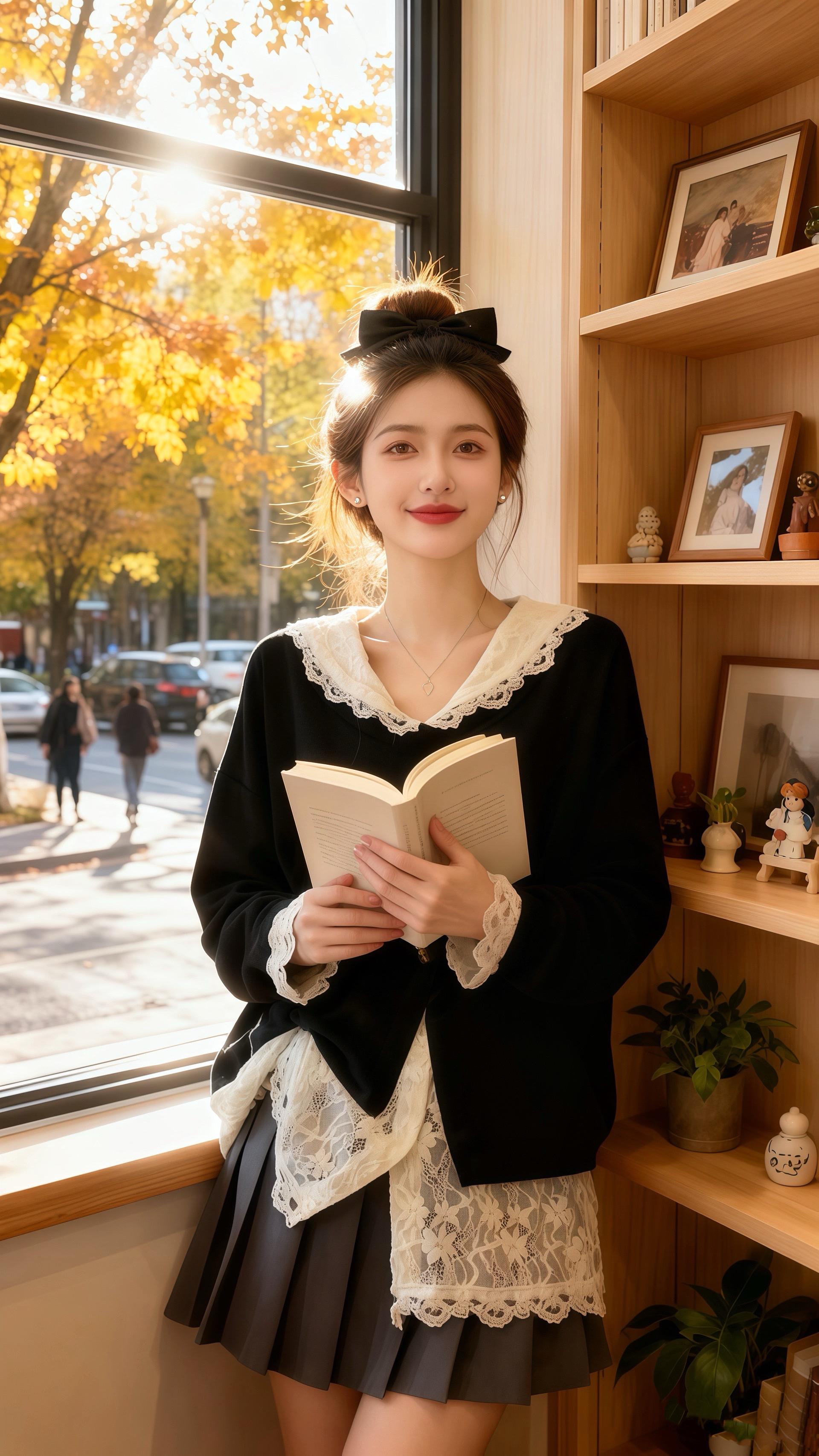 秋日的阳光漫过女装店的弧形窗,许妍指尖搭在窗沿,蕾丝袖口随动作轻轻晃了晃。皓明望着她的背影,黑色上衣与白色蕾丝的层次在光里格外柔和。