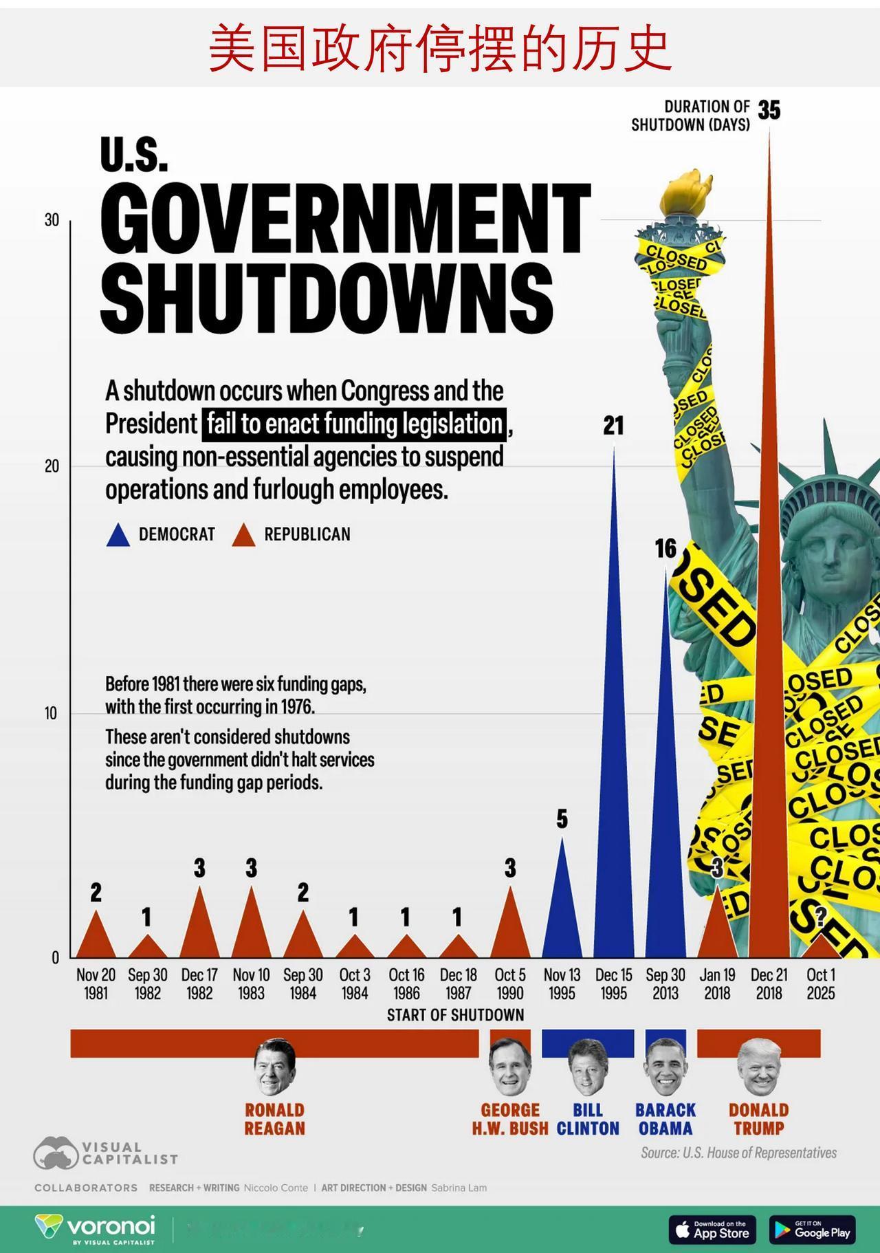 美国政府停摆的历史,共发生了15次停摆,持续了近百天 2025年10