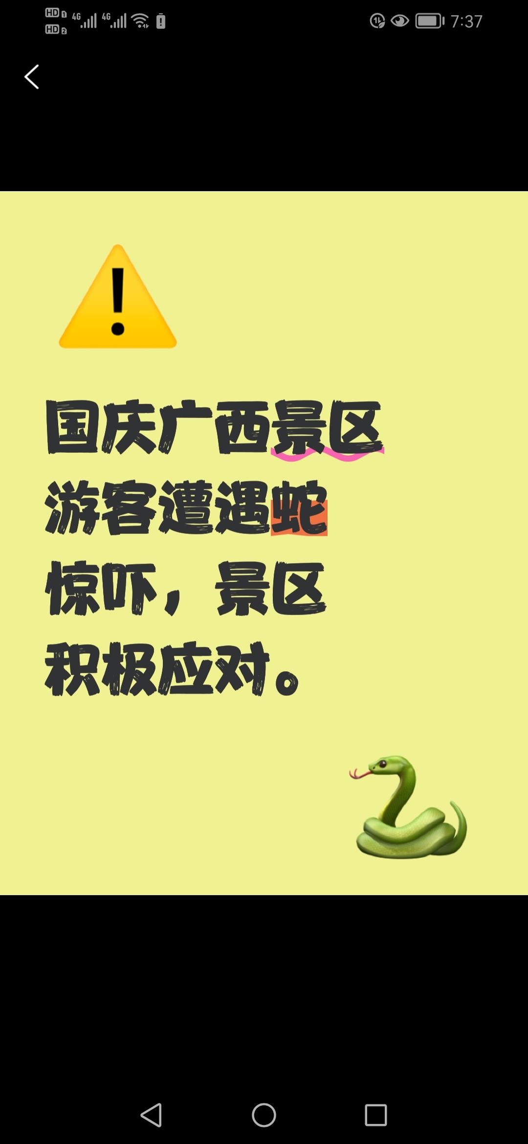 国庆期间,广西一景区滑道上突发惊魂一幕:游客遭遇1米长蛇“从天而降”,景区如何应对? 国庆假期,广西某景区发生了一起让人心跳加速的事件——一名游客在滑道游玩时,突然一只1米长的蛇从身旁窜过。这段惊险的视频迅速在网络上传播开来,引发了广泛关注。景区方面对此事高度重视,立即向游客致歉,并承诺加强园区内的防蛇措施。据景区工作人员透露,山林中偶尔出现蛇是正常现象,每年都会定期投放驱蛇药物,但此次事件仍令他们感到意外。面对游客的惊恐,工作人员迅速响应,及时处理了现场情况,并通过社交媒体平台向公众解释了这一突发事件的原因及其后续处理措施,力求消除游客的疑虑。
