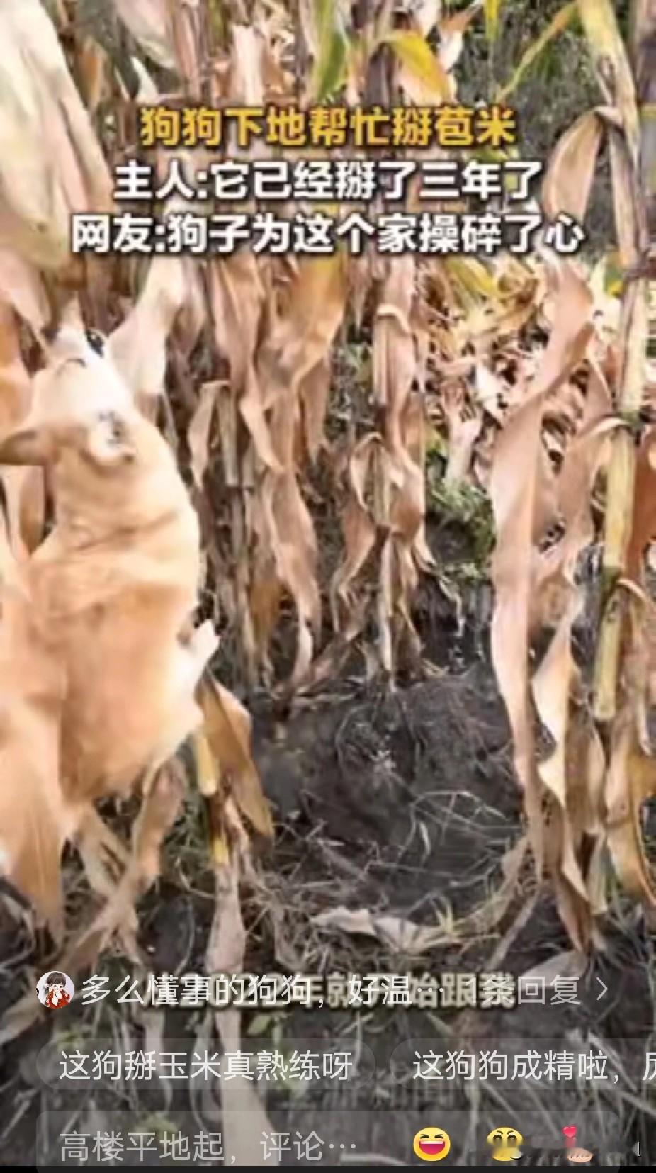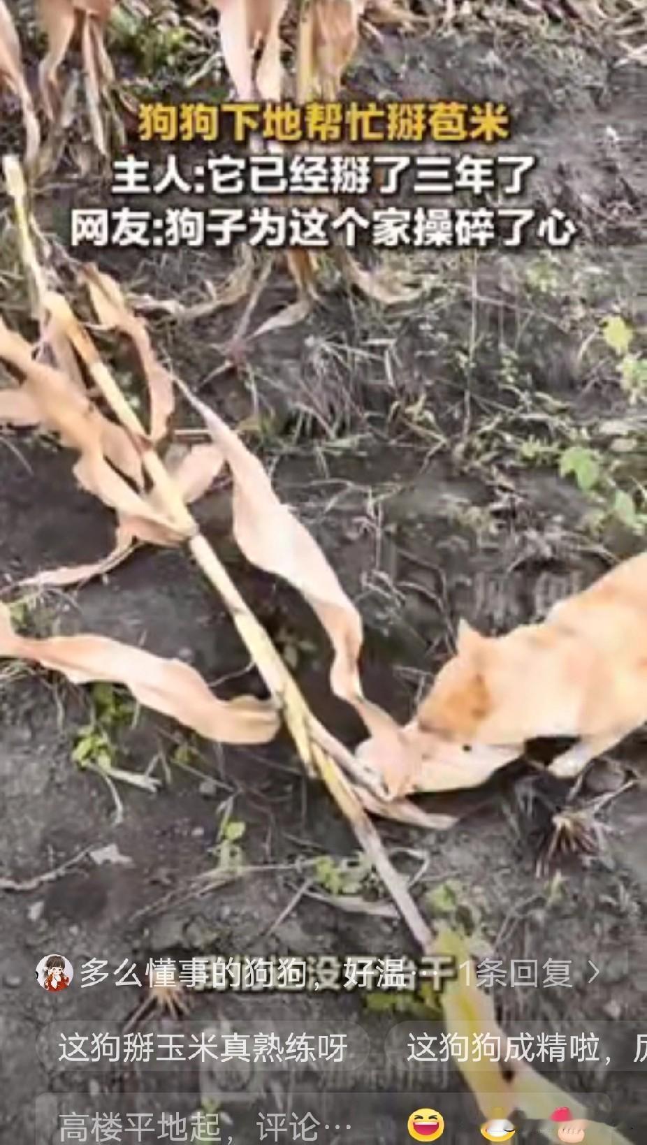 不可思议!”黑龙江一女子和家人下地掰玉米,家养的狗狗也跟着来到玉米地,还没等主人开始干活,突然狗狗跳起来咬倒玉米杆,然后用嘴巴将玉米咬掉!最绝的是它还将给玉米剥掉皮。女子将狗掰玉米的视频拍下来发到了网络上,看的网友是目瞪口呆。网友:狗子为这个家操碎了心。 这只被网友戏称为“玉米侠”的狗狗可不是临时起意帮忙,它已经连续三年担任这家人的“首席掰玉米官”了。每次秋收季节,它总是抢在主人前面开工,那双专注的眼睛专门寻找最高、最难够到的玉米下手,低矮的反而提不起兴趣。瞧它确认目标后纵身一跳,牙脚并用折断秸秆,精准摘下玉米棒的样子,简直像个经验丰富的老农。 有些挑剔的网友阴阳怪气留言:“哪个家庭幸运能吃上狗口水玉米?”这种担心其实多余了。主人解释这些是老玉米,要经过晒干、剥粒、再晒,最后磨成玉米粉多道工序,就算真有口水也早被处理干净,完全不影响食用。狗狗的帮忙反而给枯燥的农活增添了无限乐趣。 这只狗子2021年来到这个家,从第二年起就主动加入秋收队伍。动物行为学研究指出,狗狗这类表现源于高度社会性与模仿能力,它们把主人的农活视为“群体任务”,通过观察模仿融入集体。这不仅是生存本能的延续,更是对人类情感的真诚回应。就像四川拉布拉多帮老人运稻谷、广西田园犬救主一样,这只黑龙江狗子的“勤劳”本质上是长期陪伴形成的默契。 农村的狗狗确实与众不同,它们不像城市宠物狗那样享受精致生活,却懂得看家护院之余主动分担农活。三个月大的小狗甚至也会摇头晃脑地尝试给玉米剥皮,那种使尽浑身解数的模样让人忍俊不禁。这些狗狗把分担主人辛劳视为最重要职责,它们的参与感远远超过了实际劳动价值。 看着狗狗在田地里忙碌的身影,不禁让人思考动物与人类关系的本质。网友调侃“这狗是来报恩的,一顿饭都不白吃”背后,藏着更深层的含义。当大多数宠物享受着人类的照顾,这些“打工狗”却在尝试用劳动证明自己的价值。它们要的或许不只是食物和庇护,更是成为家庭一员的那种认同感。 这种动物自发参与人类劳动的现象,挑战着我们传统看待宠物的方式。它既不是马戏团式的驯化表演,也不是本能驱使的觅食行为,而更像是一种跨物种的协作尝试。狗狗可能并不理解农业生产的全部意义,但它清楚地知道自己在参与一件对“家人”重要的事情。 各位读者你们怎么看?欢迎在评论区讨论。