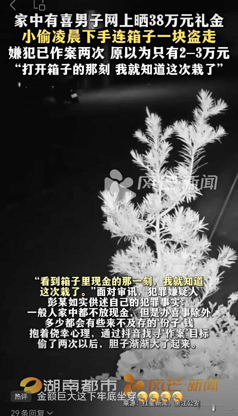 家中有喜,网上晒38万礼金,当晚家中被盗空!警方提醒:喜事也需防“有心人”! 9月30日,江西余江,彭先生报警称家里办喜事的38万现金被偷了,连同装钱的行李箱也不翼而飞了。 据悉,这38万包含了亲朋好友的份子钱、儿媳妇的陪嫁和彭先生给的见面礼。 因为人逢喜事精神爽,彭先生就在网上发布了视频,晒了晒幸福,跟大家分享了他们家的喜悦。 而恰恰就是这个视频,引来了“有心人”彭某。 彭某,有盗窃前科且有赌博恶习,欠了不少外债。 9月29日,彭某刷某音视频时,刷到了彭先生发布的喜事视频,听到视频里有人喊了一句“铁山彭总”,就利用地图搜索找到大概位置。 30日凌晨,彭某戴假发开车到了彭先生家踩点,盗窃成功后,驾车离开。 当10月2日,民警将彭某抓获的时候,彭某说,“打开箱子的那刻 我就知道这次栽了!” 彭某之前就曾两次偷过别人喜事的份子钱,大多数人都会以为是熟人作案,觉着家丑不可外扬,所以两次都没人报警,彭某都成功了。 没想到,这次成果太大,彭某栽了!至少10年起步。 网友们纷纷劝说,老祖宗早就说过,财不外露!因为就怕有心人啊! 彭某只是刷抖音看到人家家中有喜,知道家里肯定有现金。通过视频中有人喊了一句地名,就能搜索到位置。 只要到了村里,谁家办喜事一目了然。 这难道就是传说中的“世上无难事,只怕有心人”?只是可惜,这个“有心人”的心用错了地方! 等待彭某的将会是法律的严惩! 信息来源于风芒新闻,侵联删!