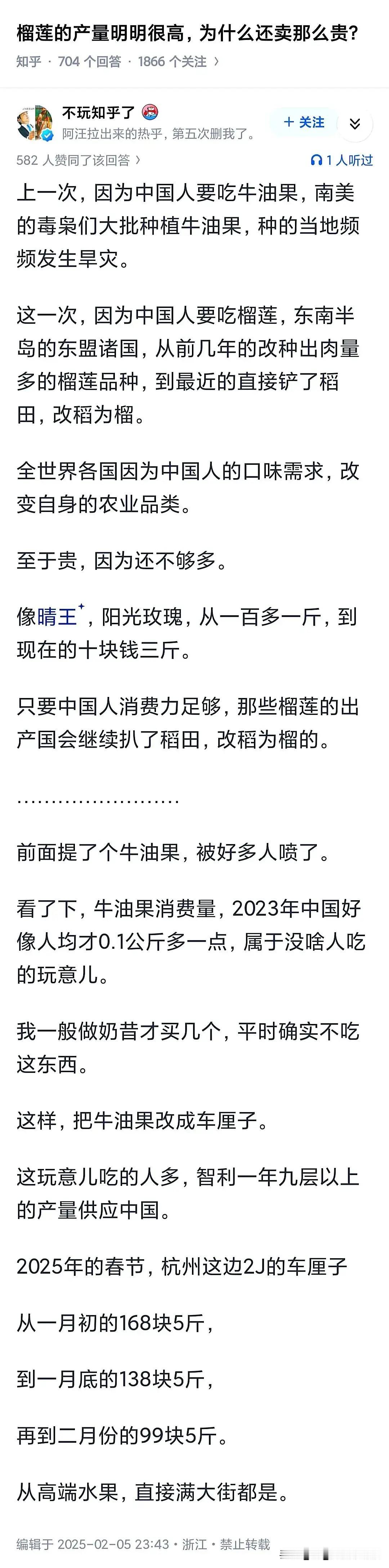 榴莲价格迟早被打下来! 国内榴莲产量低,即使大面积种植,也满足不了需求。现在中南半岛国家都已经大规模种植榴莲,产量大了,也就便宜了。 其实榴莲价格高,也是必然的。一些人喜欢吃高价水果,价格低了,反而就卖不动了。以前晴王葡萄刚出来,卖出来几十元一斤的价格,供不应求。现在晴王葡萄都要烂大街了,到处都是,而且价格很低,反而没人买账了。 买榴莲的大多是女性,她们也想靠着高价的榴莲来彰显身份,意思就是自己吃的起高价的榴莲。如果榴莲价格被打到10块钱3斤,那没人买账了,都是平民水果了,她们就会买别的高价水果了。 就像车厘子水果,以前多贵呀,买的人不少,现在车厘子降价了,反而也就卖不动了,这都是现实。 所以高价水果不在于好吃不好吃,而是在于吃水果要吃出个身份。如果高价水果变便宜了,自然就转到新的高价水果了。吃水果的意义,不在于水果本身,而是在于吃水果的彰显身份,就这么个情况。