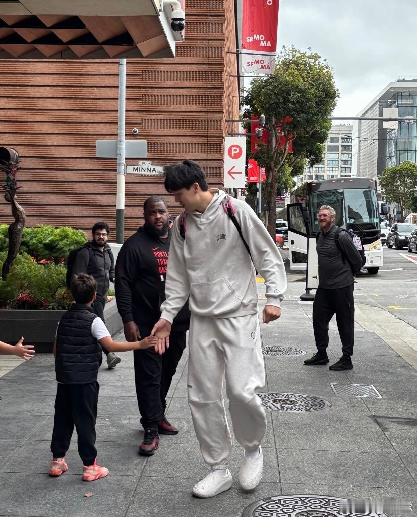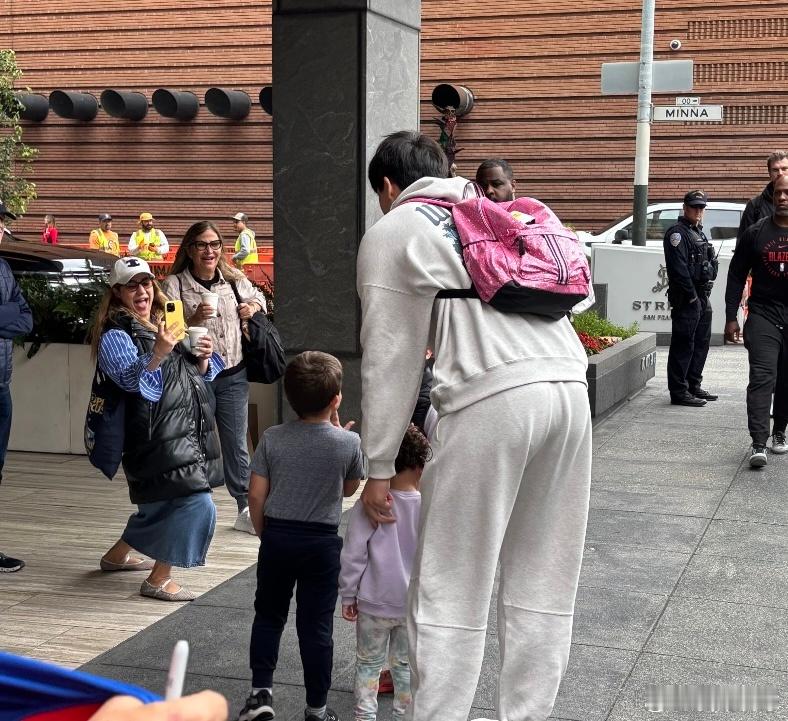 杨瀚森和外国小球迷们合影,还背着前几天的粉色小书包,看来小杨是真喜欢[嘻嘻]