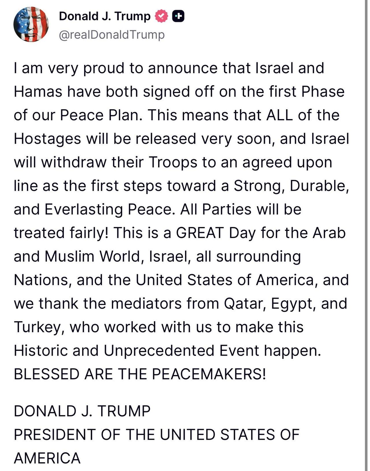 🇺🇸特朗普宣布:我非常自豪地宣布,以色列和哈马斯双方已经签署了我们和平计划的第一阶段。这意味着所有人质将很快获释,而以色列也将把部队撤回到双方商定的防线,作为迈向强大、持久和永恒和平的第一步。 所有各方都将受到公平对待! 这对阿拉伯和穆斯林世界、以色列、所有周边国家以及美利坚合众国来说,都是伟大的一天。 我们感谢来自卡塔尔、埃及和土耳其的调解人,他们与我们合作,使这一具有历史性和前所未有的事件得以发生。 愿缔造和平的人蒙福! 唐纳德·J·川普 美利坚合众国总统