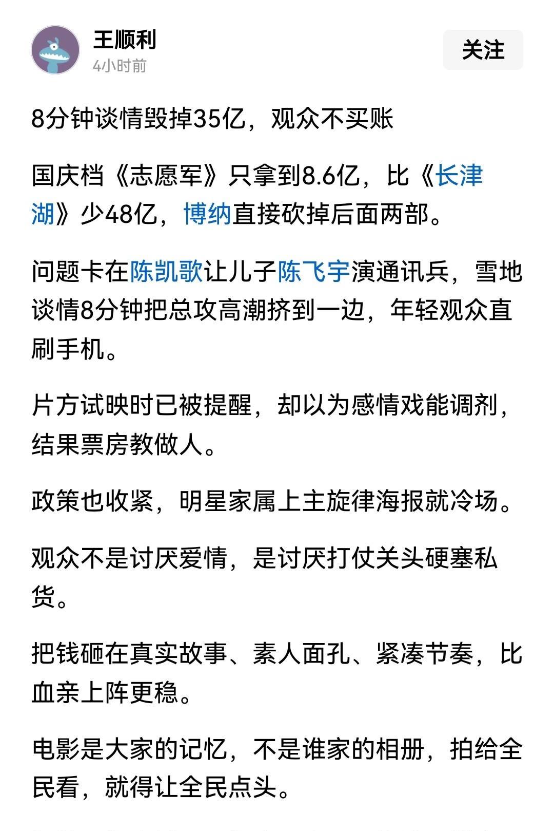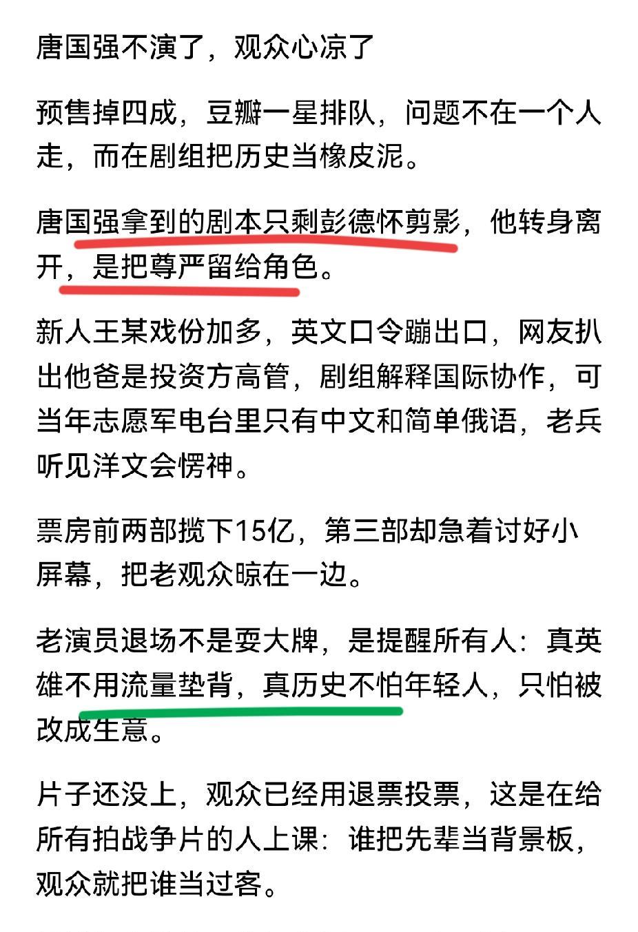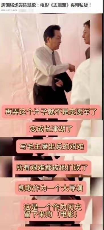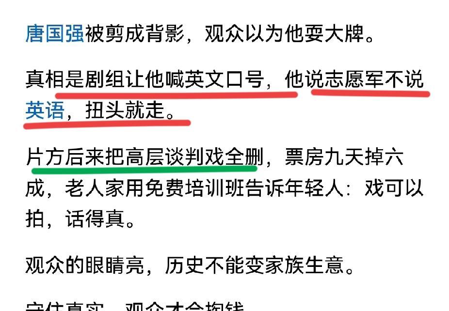 原来唐国强愤怒的背后不只是领袖镜头被全剪,还有剧组让志愿军喊英文口号?拍志愿军电影,想捧自己孩子可以,但不能把捧孩子拍成电影的重头戏吧? 抗美援朝和志愿军在中国人心里的地位和分量,陈导不会不知道吧? 抗美援朝是立国之战! 志愿军是最可爱的英雄! 此二者,绝不容被玷污!